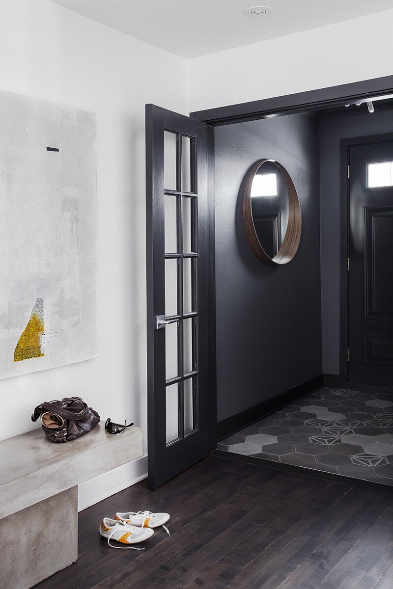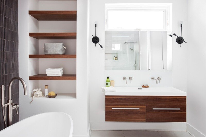 The existing floors were refinished in a smoked grey matte palette and offset the warm walnut accents in the kitchen and soft white walls. With an abundance of white walls throughout, feature walls were essential in both the master bedroom and ensuite.