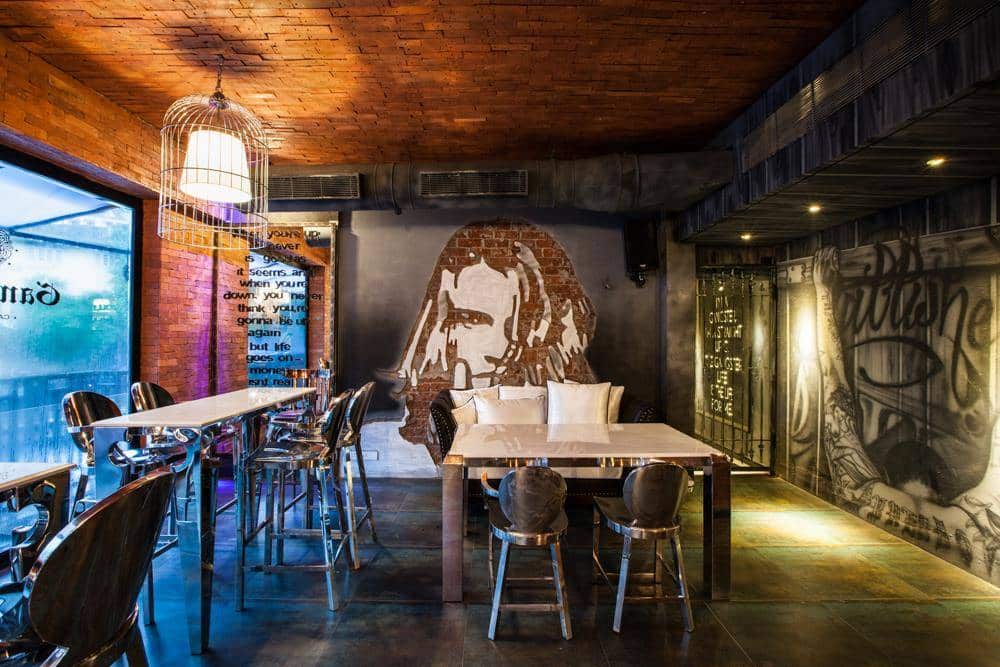 Gangsta’s cafe and bar as the christening goes is predictably dark and grungy with metal doors, cable chains, jail bars and tattooed walls that boast of dark creatures in charcoal silhouettes.