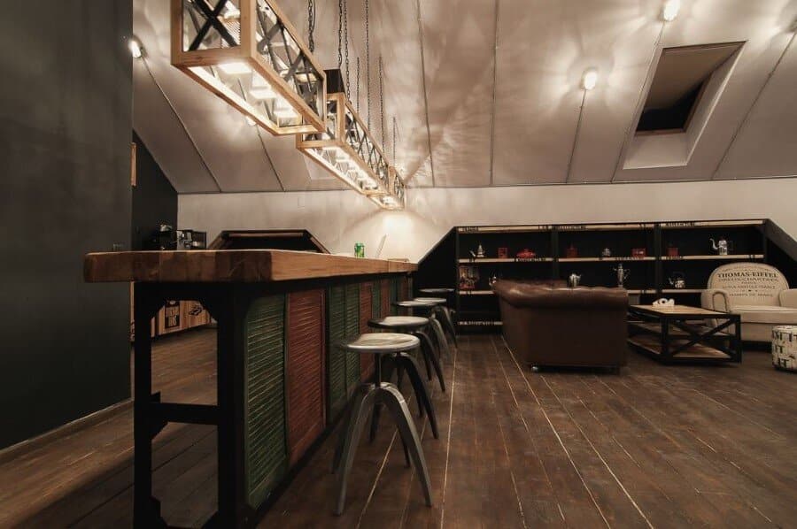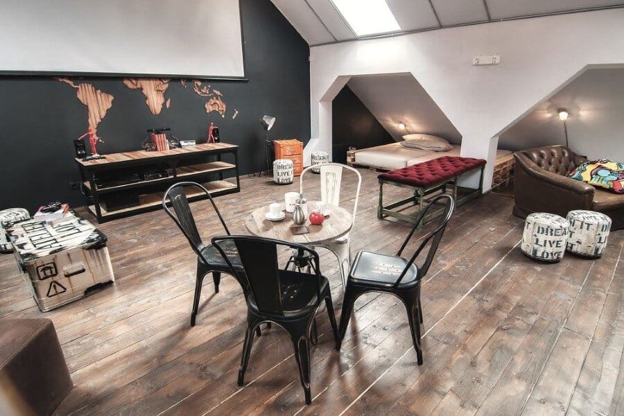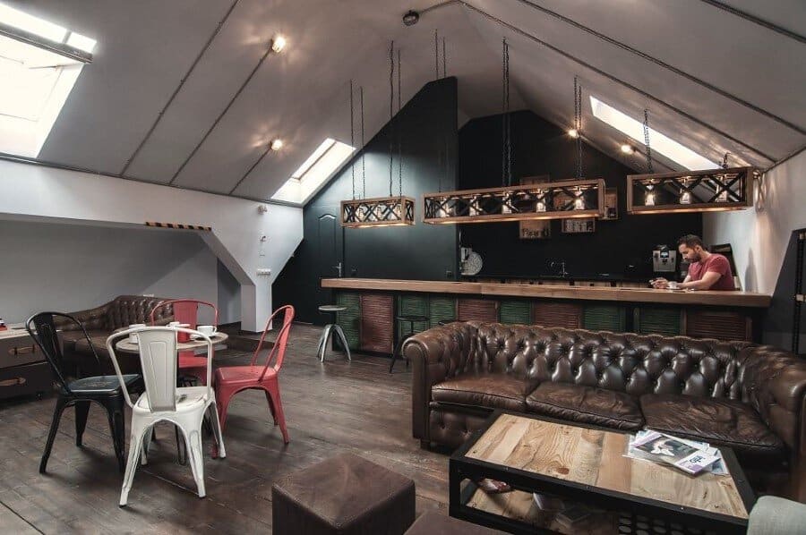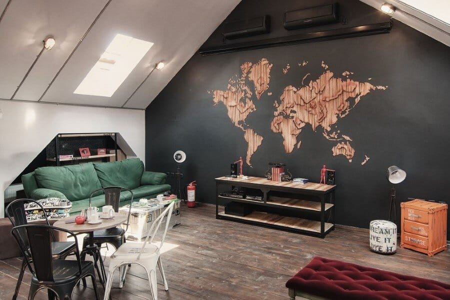 Once you take the stairs, on the left side you will find some lights apparently as shadows of classic desk fans. Thus the industrial lights, the recycled materials in an unfamiliar pattern with shapes and colours apparently disorganised, the world map, they all come to underline the idea of“global awareness” by appreciating the diversity and complexity of sizes all gathered in a single entity. The countertop made of solid wood, the lights shaping out of kitchen graters with a different utility, the bed in the corner of the attic made from old wooden pallets, the pouffes and tables made from vintage travel bags, all of them pointing out the idea of vintage mixed with the industrial character as a new trend in design.