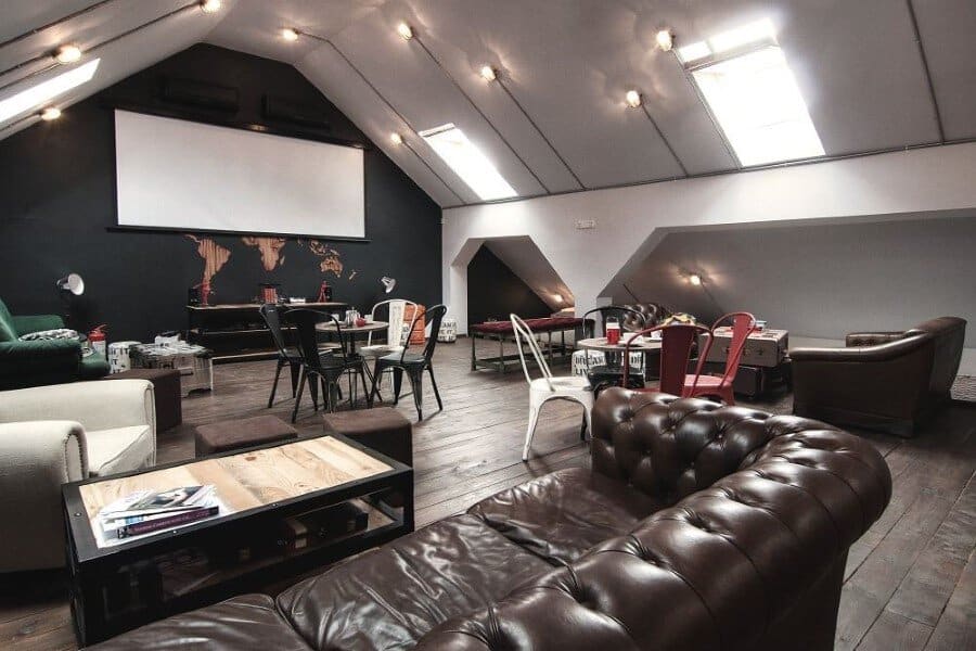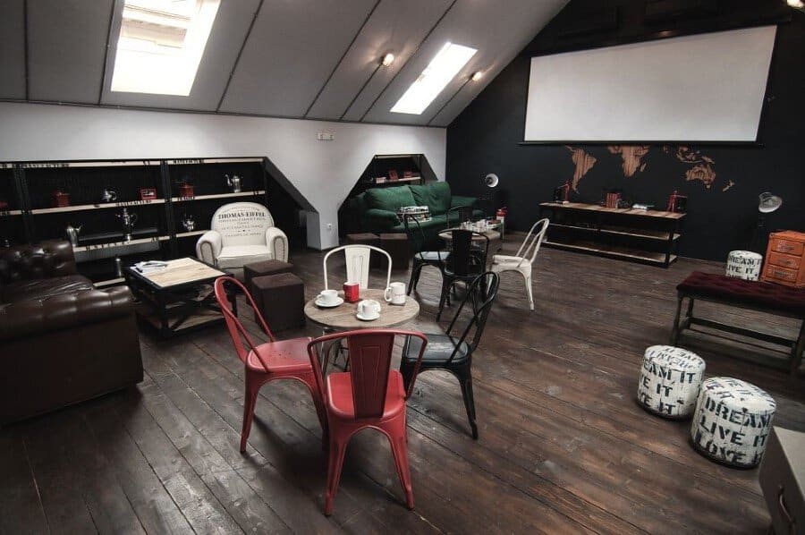 The atypical open space placed on the 2nd floor is differenced by the wooden recycled pallets and the industrial structure of the ceiling made also from solid wood, along with the modern furniture pieces and its layout around a central area designed for meditation (couches made from natural materials).