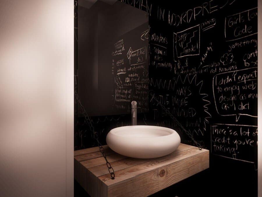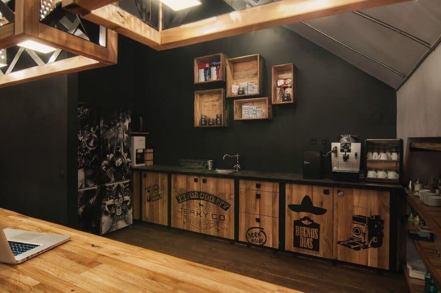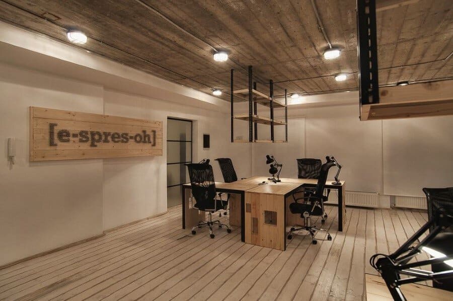 Description by Ezzo Design: [e-spres-oh] is meant to be a studio of creation and relaxation, a real brainstorming for the software developers working in this office. Right from the very beginning you are guided by the symbolical entrance which announces the experience you are about to see behind the “door” with an ironic message “beware of geeks”. As soon as your perception returns with a smile, you will discover the real story behind the door: although it is a space designed for offices, the atmosphere that wraps up the room is relaxing, being framed in wood and shabby-chic floors, the industrial pendants, not to mention that piece of wood pierced by screws in a shape that reveals the identity of this office placed on 3 levels: a cafe, an office and a lounge, under the same roof, but under a different dimension: [e-spres-oh].