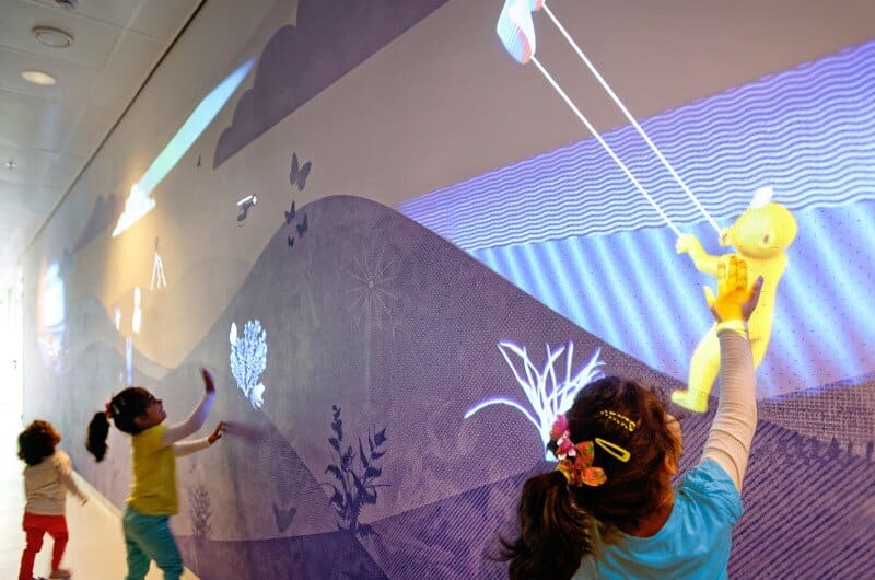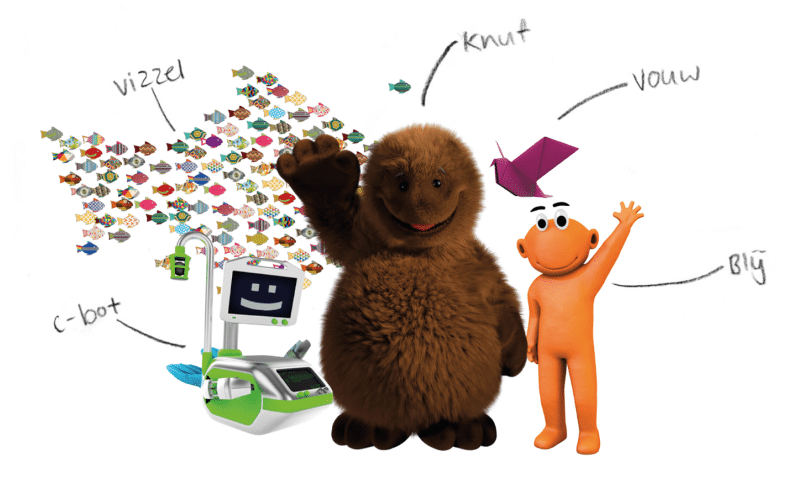 Five characters, Hugg, Happy, Fold, C-bot and Vizzle, play the main roles in the children’s experience. These little friends accompany the patients on their journey through the new Juliana Children’s Hospital and appear everywhere. In the most nerve-racking situations, such as the corridor to the OR, the treatment rooms and the elevators, these characters come to life in moving projections and interactive animations.