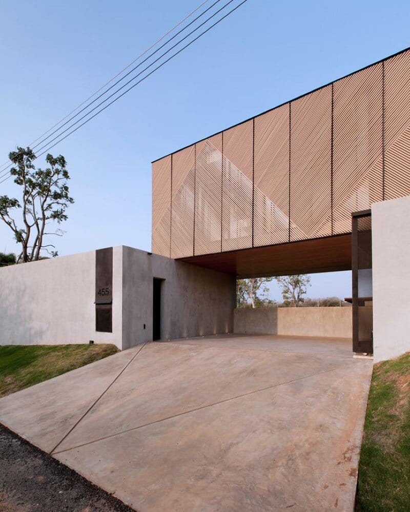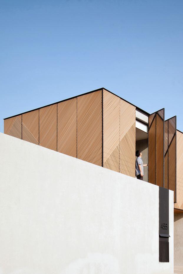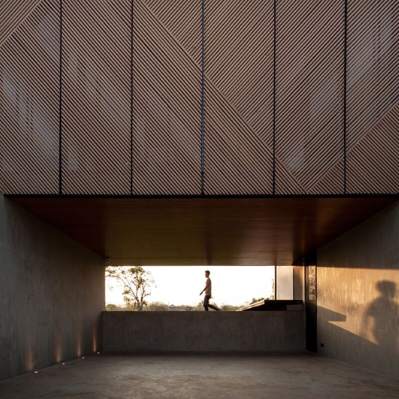 The house was wrapped by triangular wooden lath creating diverse degree of openness though different points of view and times. Light and shadow play an important role in different times of the day. In the morning, the soft light will flow to the bedrooms creating a playful shadow around the area. In the afternoon, light will flow to the living area and hallways. The lath can be opened. It acts as a sunshade, a visual screen for AC compressor, additionally creating lively shadows in the house and adding privacy to the owners during the night time. Visit Idin Architects