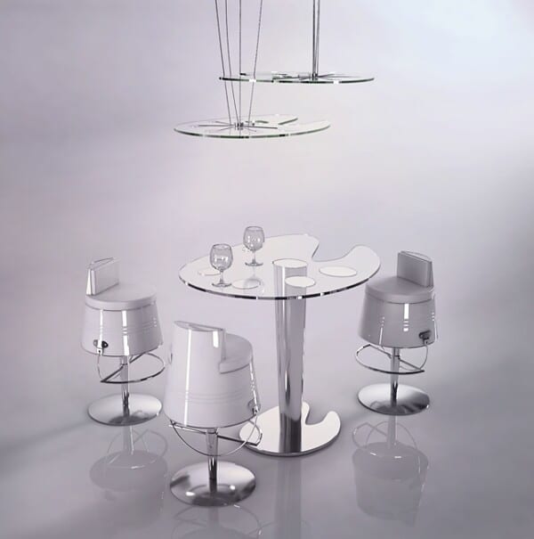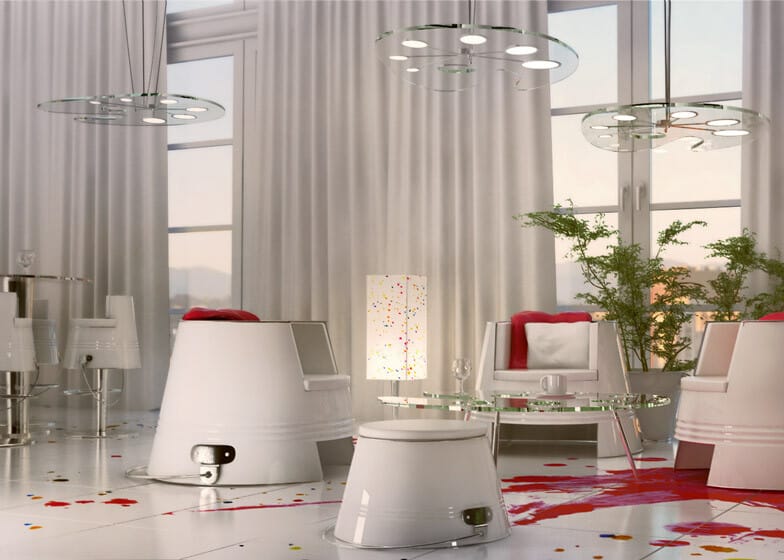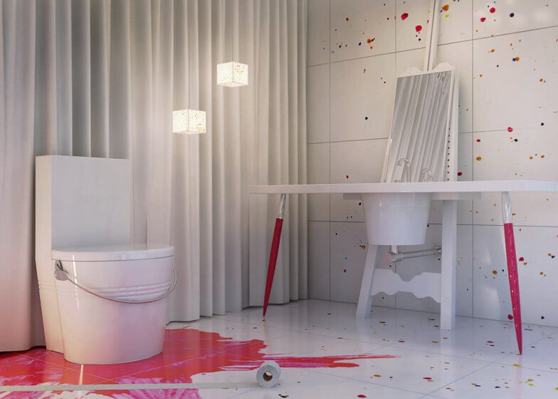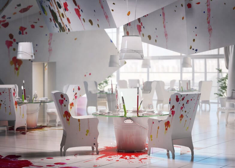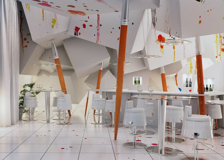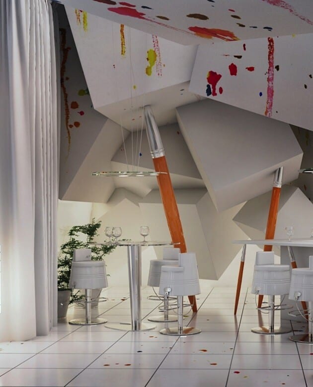 The entire interior of the restaurant, starting from the floor and ceiling till the furniture, it is chaotically “splashed” with paint in all colors. The white color dominates the interior. The splashes of colors are highlighted even more on the background and the presence of silver brings an additional note of elegance. The columns shaped as paintbrushes seem to support the ceiling formed of randomly chained cubes. The suspended lamps and tables are made of transparent glass and they are shaped as painting palettes. Also, the buckets in which the “imaginary painter” would have kept the paints had become suspended chairs, tables and lamps. On the restaurant tables, we encounter brushes with the role of “electric candles”. The fantasy of designer Karina Wiciak goes further and the theme “painting workshop” is also continued in the bathroom, giving to the sink and toilet bowl, shapes of buckets. The painter’s easel turns into the bathroom mirror.The design of Pracownia restaurant, elegant and colorful exudes dynamism and vitality, it brings joy and delight to the eye, flaring up your imagination.