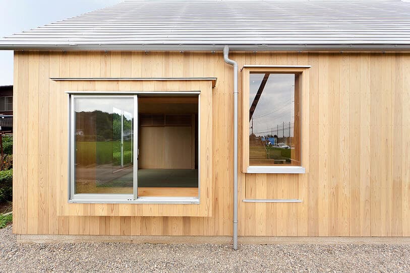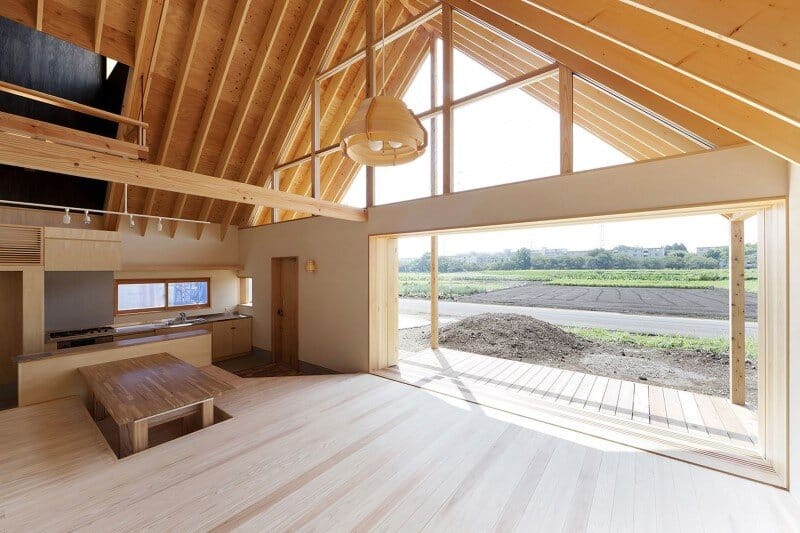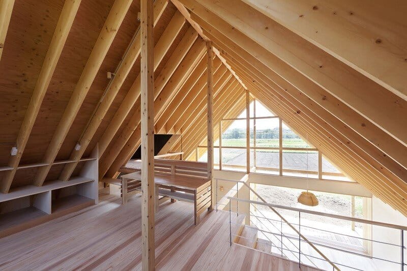A 45-degree pitched roof is selected to create a large interior space and an efficient structure. The roof rests on a simple 105x105mm wooden framework and is made of 2×12 rafters spaced 455mm apart, and uses structural plywood for earthquake-resistance. A fully glassed gable allows dynamic views to the rural landscape. The roof and its structural directionality emphasize the perspective from north to south.