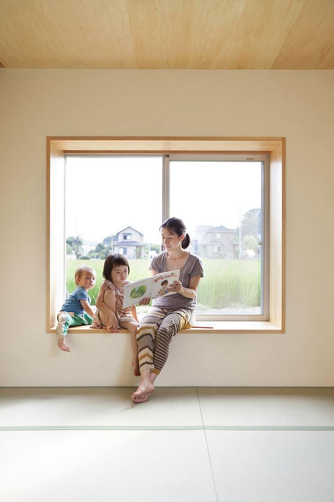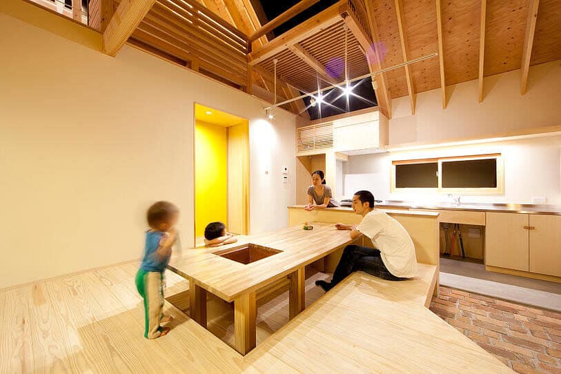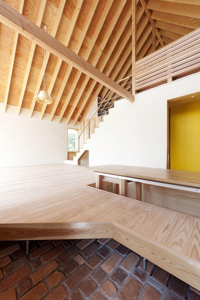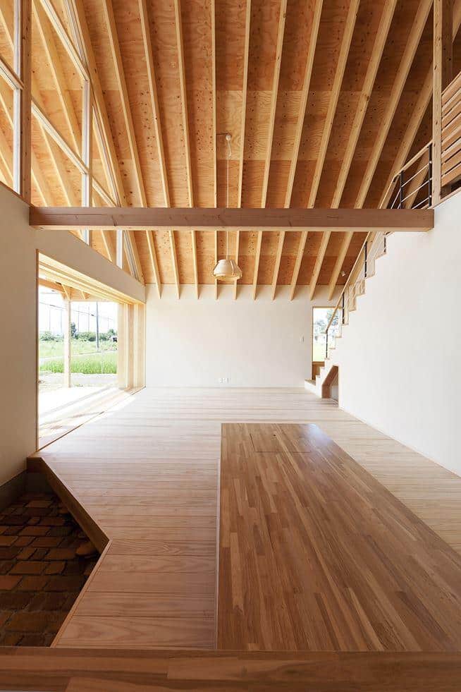 In the design, a large roof frames the landscape and shelters the family below. An open living room is placed in the southern portion of this 8.19m square area; contrastingly, the private spaces such as bedrooms, lavatories, and storage are allocated to the north portion. This planning creates gradual and continuous layers of privacy, connecting the front farm, garden, terrace, doma-space, and the open living space through to the children’s room.