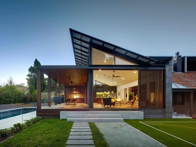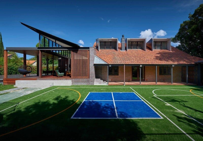 Description by Virginia Kerridge: This house explores the idea of “grafting”, a concept often used in Japanese gardens. Grafting is where a branch or plant is cut and a piece of another plant is added and held in place. The idea is to encourage the tissues of one plant to fuse with those of another. The house is on a double block, one half of which is a tennis court that is no longer full size, but which is in constant use for games and as a playing area.