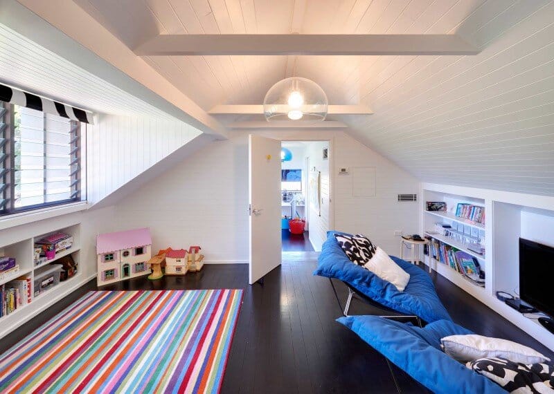 A small parasol zinc roof has been carefully inscribed to allow for head height from the existing (very low) verandah to the new living area. The gestural roof over the living area looks up towards the sky and seems to grow out of the existing building. Three new dormer windows in the children’s level on the upper floor allow light and air and a view across the adjacent parkland area. The adjacent park acts as a borrowed landscape which seems to become part of the site. Visit Virginia Kerridge Architect