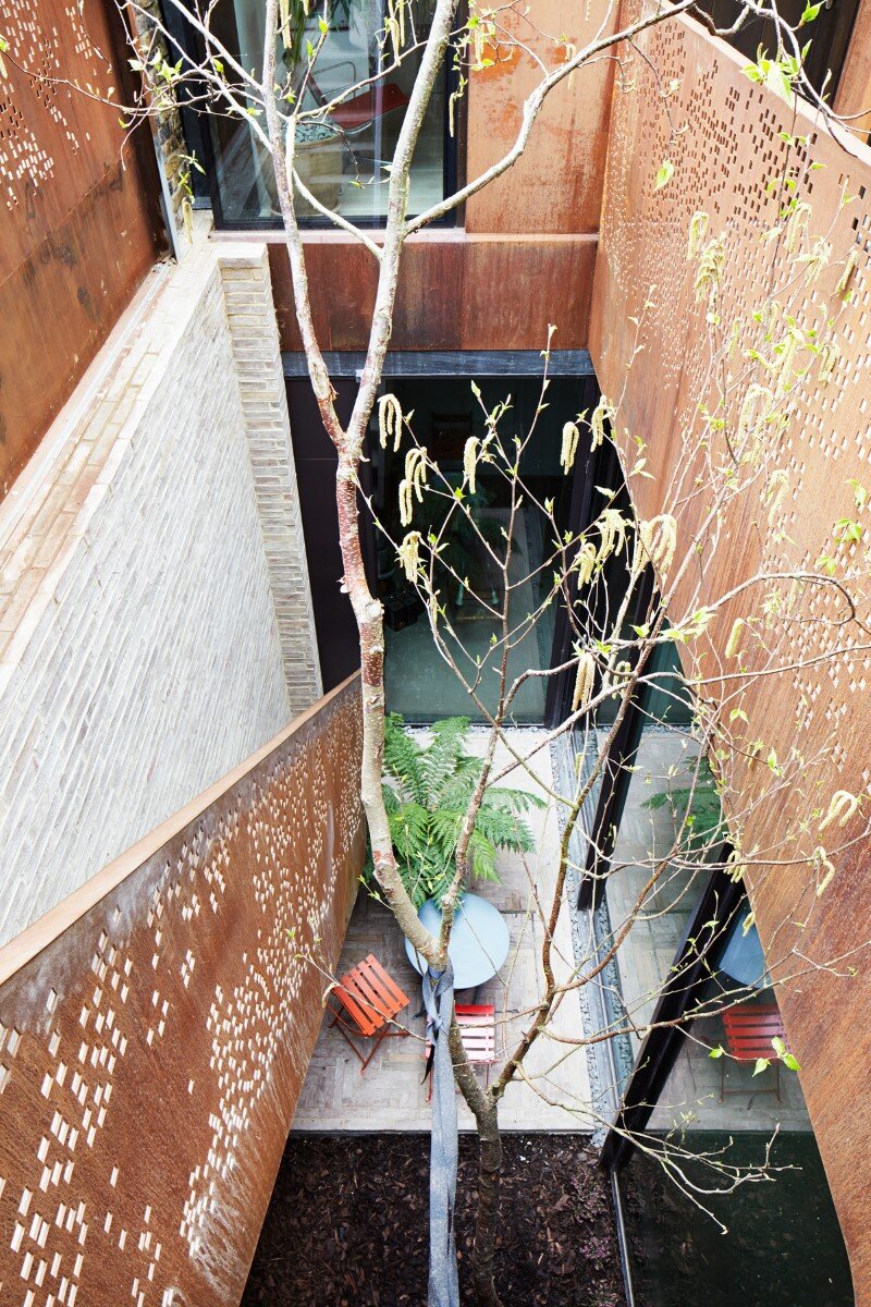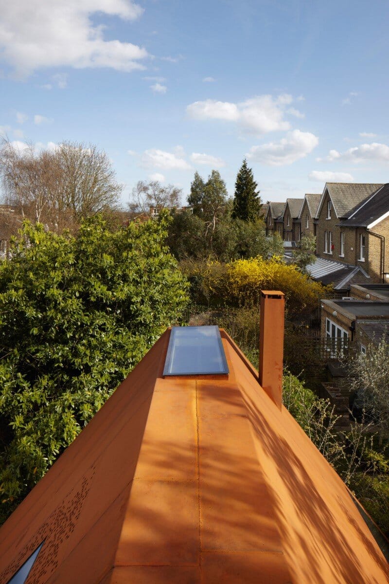 A list of planning constraints – including a conservation area context, a change of use and no access on three sides -formed a backdrop to the project. To overcome these challenges Piercy&Company inserted the house behind a retained 19th century brick gable end and split the house into twin gabled forms in keeping with local massing. The natural patina of the weathering steel with its marks, stains and perforations giving the surfaces different characters depending on the exposure and orientation, anchor the form into its context and impart a sense of permanence.