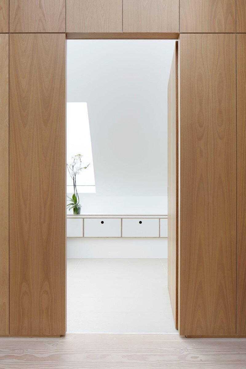 The house is formed of a simple plan to make the most of the constrained site, reduce the building’s mass in the streetscape and respond to the living patterns of the family. Consisting of two rectangles; one slightly smaller, set back and sunken 1m lower, the wings each have living spaces on the ground floor and bedrooms above. Connecting the wings is a glass encased circulation link which allows light to pour into the house whilst providing breathing space between internal spaces. Inside, oak veneer paneling and Dinesen flooring are the basis of a light, natural and refined palette of materials.