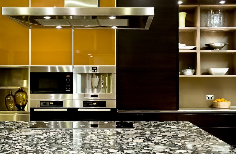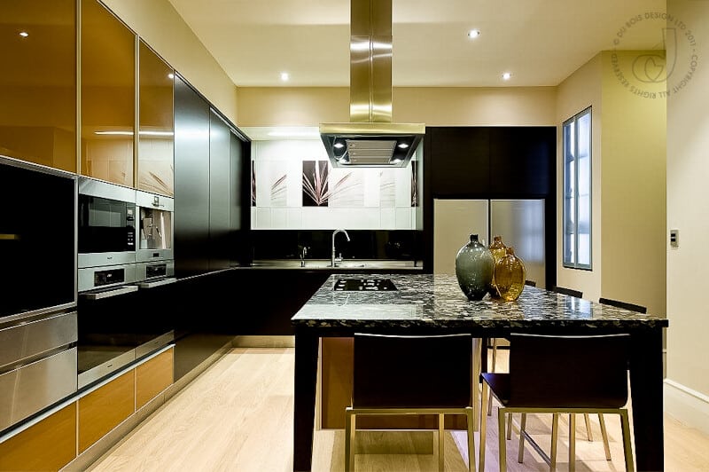 The designer’s description: Careful thought was put towards mixing colours and textures in this kitchen space. The mouth watering chocolate, caramel, and buttery tones chosen were all inspired by sweet confectionary and the aim of making the space feel like a café at home.