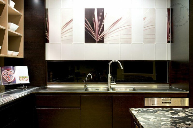 Creamy light timber floors, chocolate stained veneer cabinetry, caramel coloured glass and fudge melamine interiors all helped create this effect. Natural flax images on sepia printed tiles are fitted above the horizontal window to give this kitchen an added artistic and original flavour. Each tile has been separately printed with an image and these have been laid out individually to create a centre piece of art.
