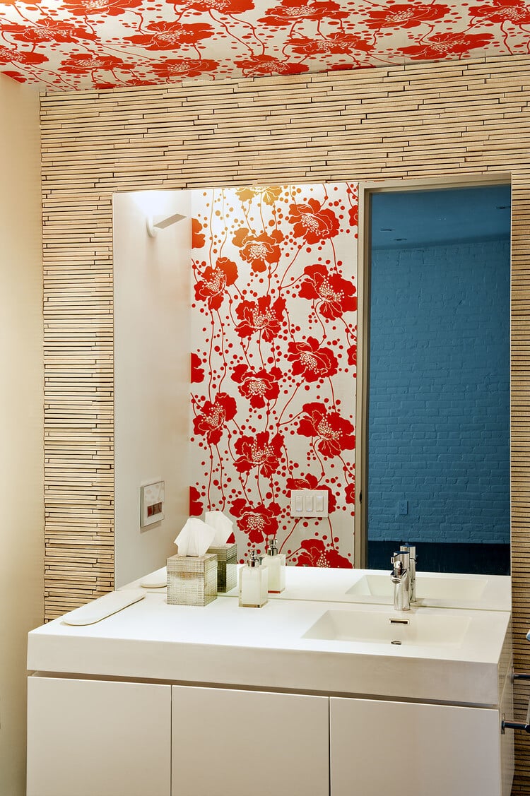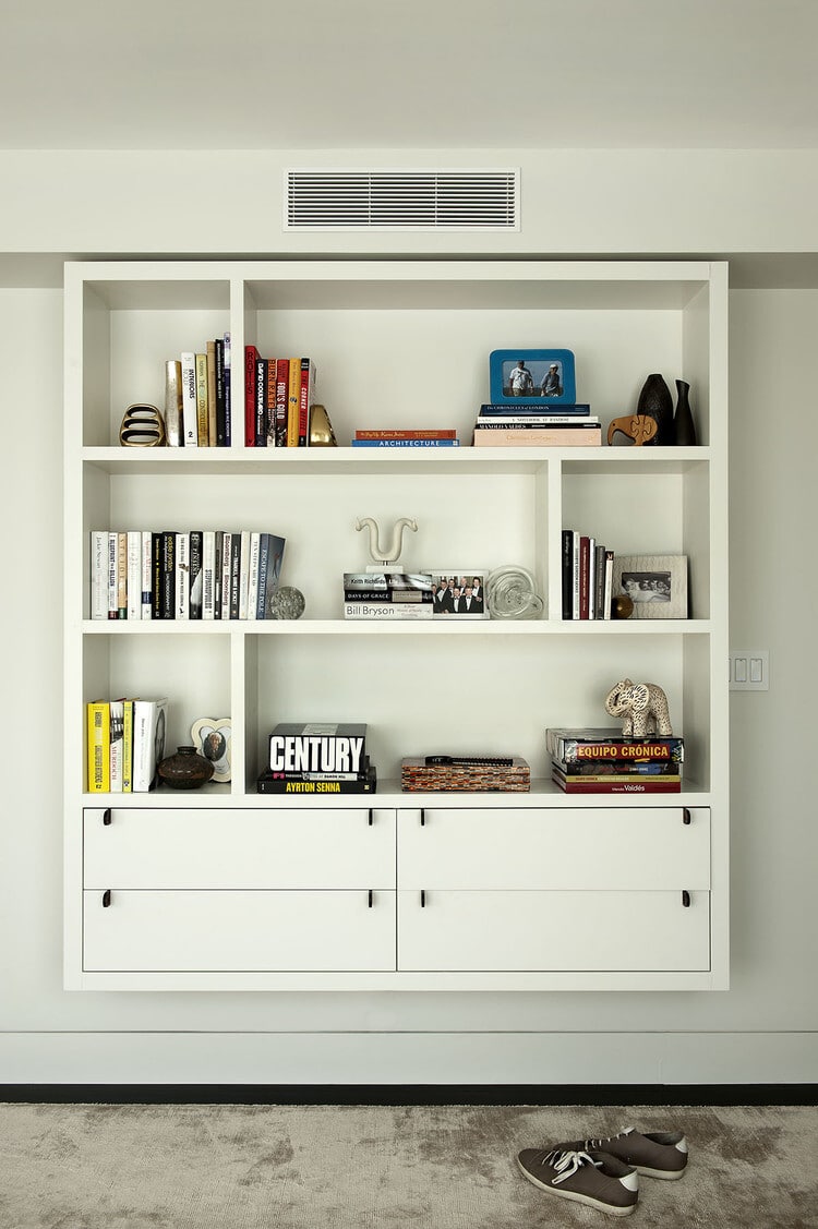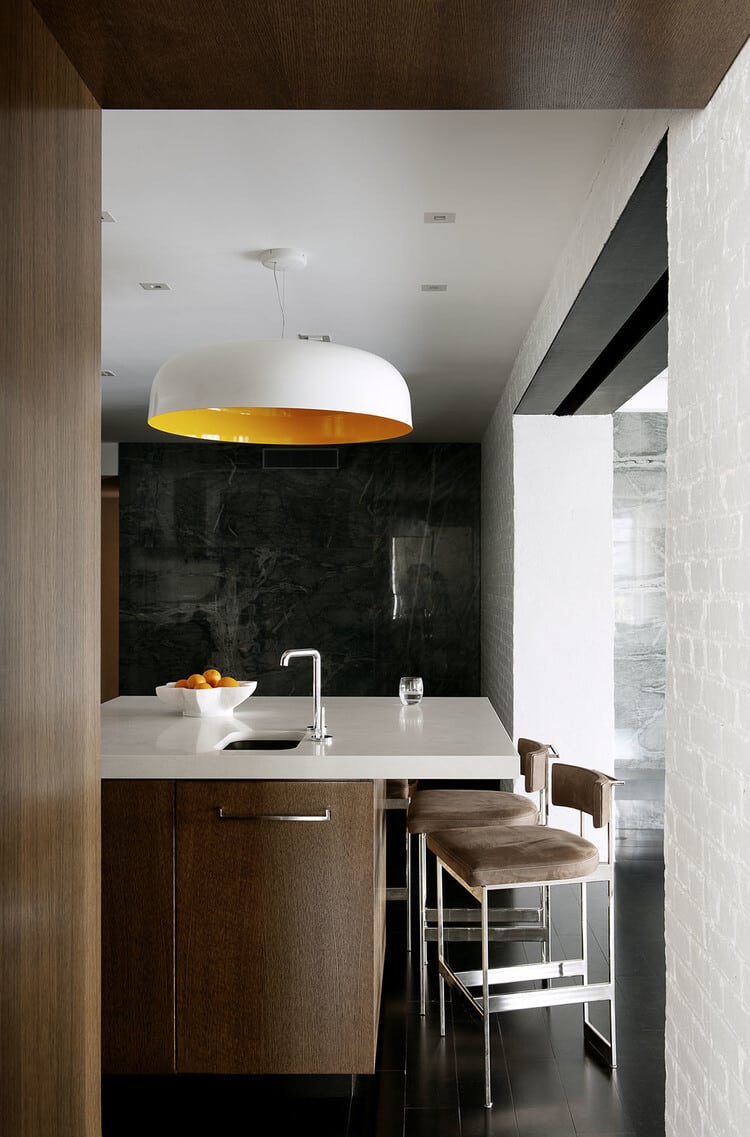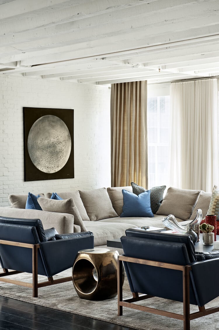 Keeping the apartment’s aesthetic in tune with the architecture, pieces were kept modern, functional, and formed to look effortlessly stylish. Colors were chosen carefully, with pops of orange in the kitchen and rich blue leather in the living room, and the entry’s quietly chic design sets the tone as one enters the space.