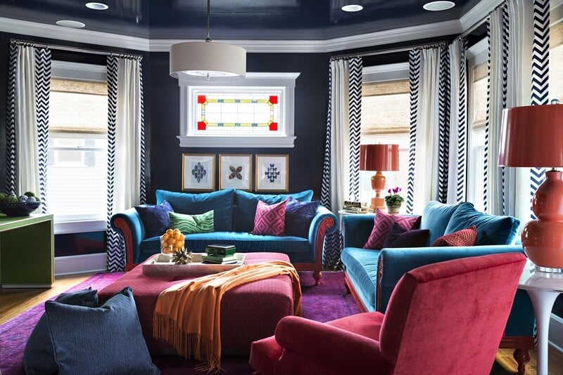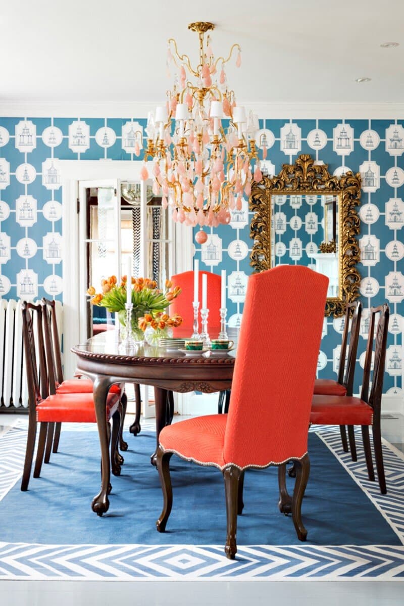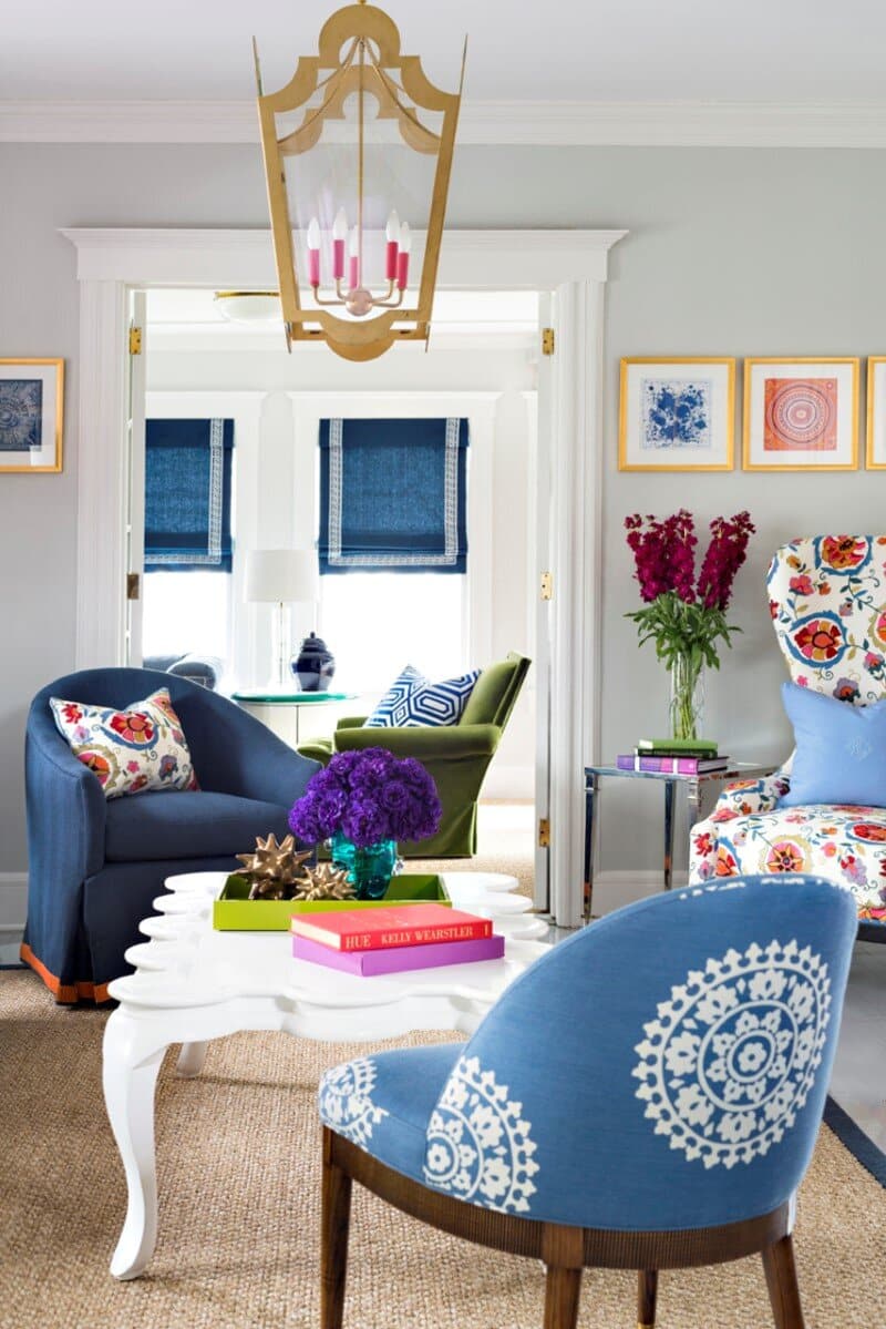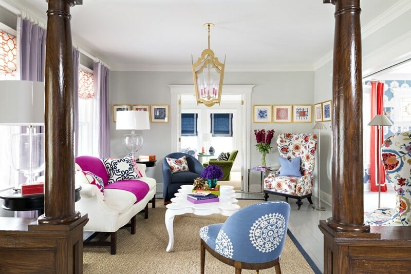 2. Create balance. Note the pairs: lamps, chairs, pillows, trees. “Symmetry adds a sense of harmony to a room that’s packed with color and pattern,” says Mazzarini.