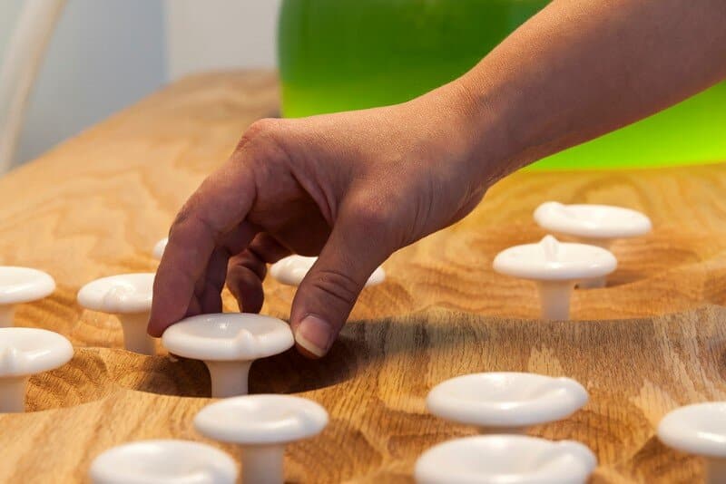 The microorganism Spirulina was selected for the installation for its ability to thrive in very alkaline waters, where most bacteria cannot live. As the algae grow very quickly, the character of each vessel changes continuously. The liquid becomes a deeper rich green and absorbs more and more light from the internally lit vessels. Individual Spirulina filaments which are just barely visible to the naked eye (⅓ of a millimeter long) can be seen mixing inside the glass vessels. Once filtered, the algae can be dried from a viscous paste into a fine, green powder which is over 60% protein by weight and is mostly flavorless with a hint of grassiness. During the course of the installation, we are working with bartenders and chefs to create drinks and dishes which feature Spirulina at special events held in the installation. Living Things by Ethan Frier and Jacob Douenias