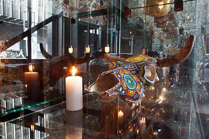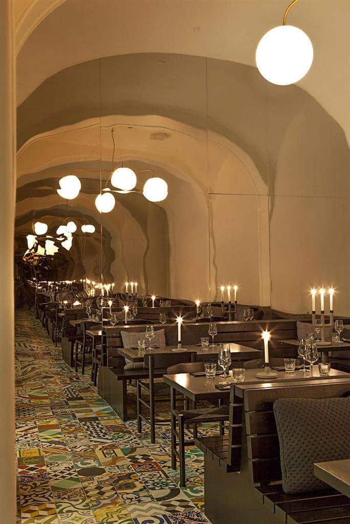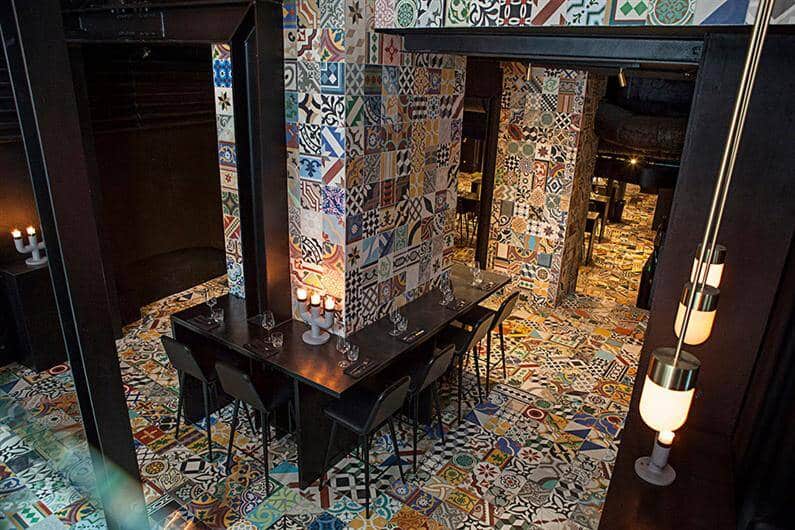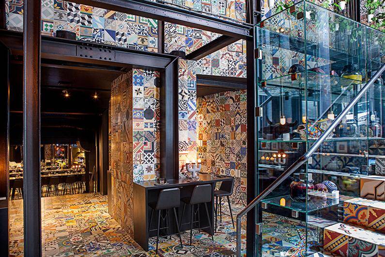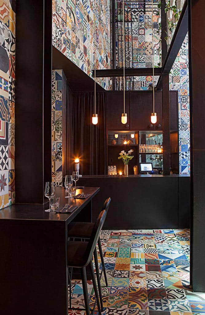 Larsen and Lange designers have created an open space full of life, generously connected to city. The walls and floors are lined with handcrafted Mexican cement tiles, melding iconic design influences from Latin America with Copenhagen cool. The interior design follows some basic guidelines: colorful tiles with different designs, black furniture, a vibrant green wall and lighting bodies of brass. All this create a unique spatial configuration and a successful symbiosis between the two cultures.