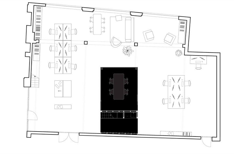 The central design idea behind the transformation of the office was to keep the scale, transparency and lightness in place and to connect the office to the main atrium of the building. Therefore the central element was designed as a hybrid between a room, a wall and a piece of furniture; it divides, connects and provides service space.