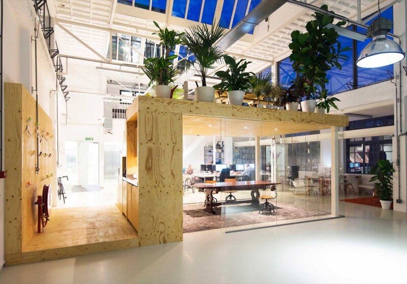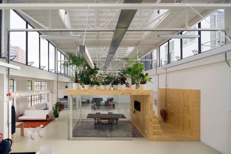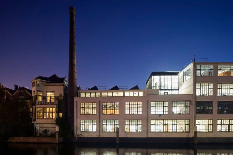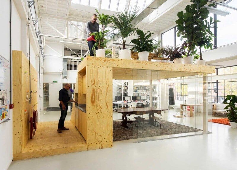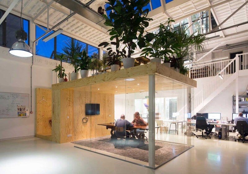 Jvantspijker Architects have redesigned the main space of an old steam factory in the Delfshaven neighborhood of Rotterdam, to become an open loft office. A central glass meeting room, with a pantry and stairs leading to the plant-filled roof organizes the large warehouse space in a single sweeping gesture, transforming it into a generous and optimistic working space.