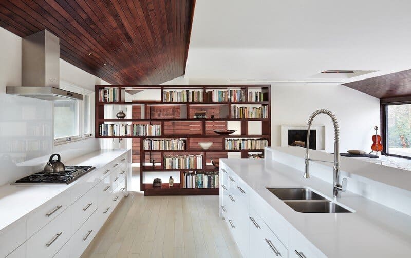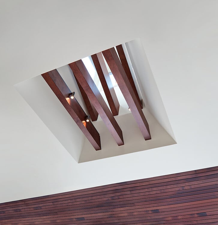 In response to both the spectacular surrounding landscape and a desire to improve energy performance, a highly insulated envelope was developed. The envelope was finished in a horizontal open-joined rainscreen with cedar boards charred using the traditional Japanese Shou-sugi-ban burning method. This technique was also used internally on sloped ceiling planes, walls and screens. Concealed lighting and mechanical systems were introduced throughout the interior. To complement and enhance the existing terrazzo floors, lacquered cabinetry and polished stone finishes were employed throughout the new kitchen.