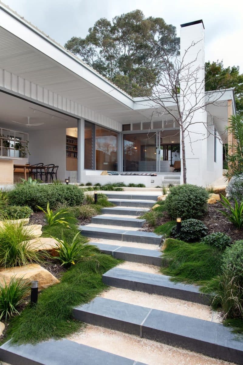 An open carport at street level allows physical passage as well as visual access under and through to the garden, itself a gentle upward slope with endemic vegetation and orientation to secure generous northern aspect to the internal spaces.