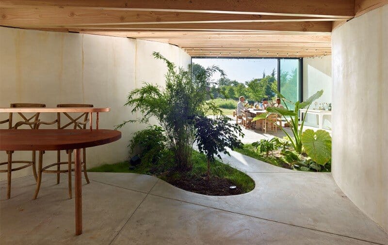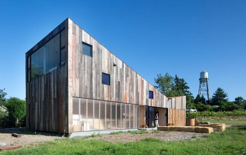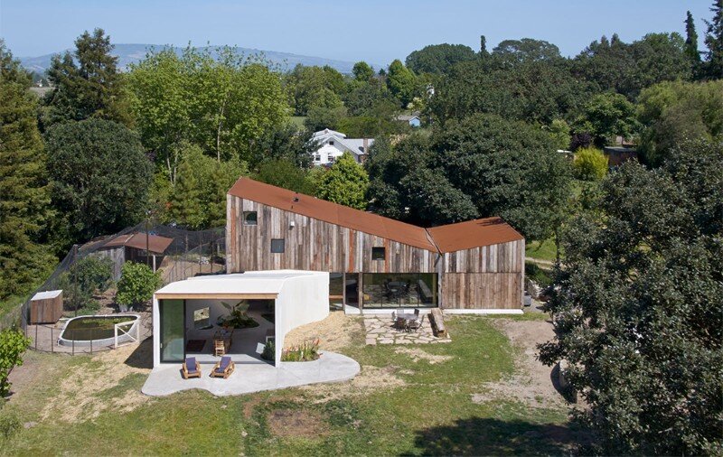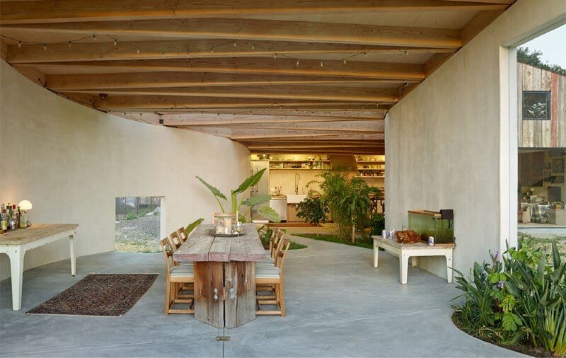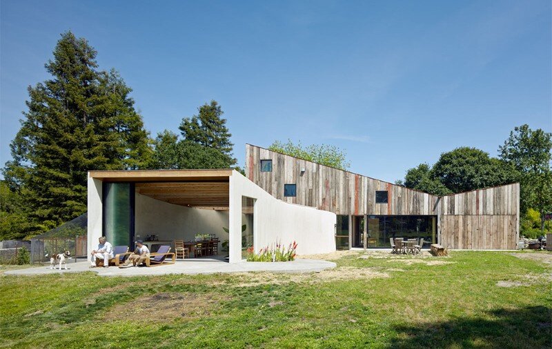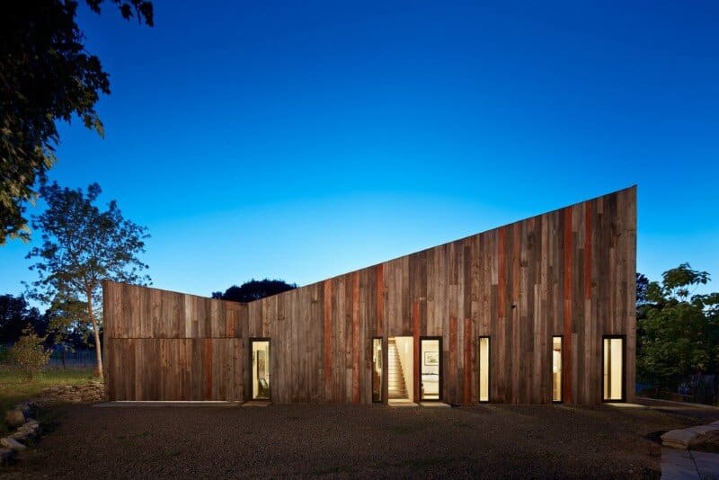 Update: Meier Road Barn has been recently extended – The Amoeba is an extension that hosts an indoor-outdoor kitchen, dining area and garden. Curving concrete walls stand in contrast to the rectilinear barn yet tie the two together through the form-work made of salvaged barn board.