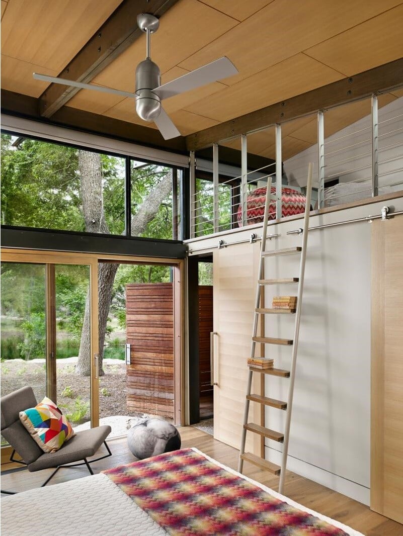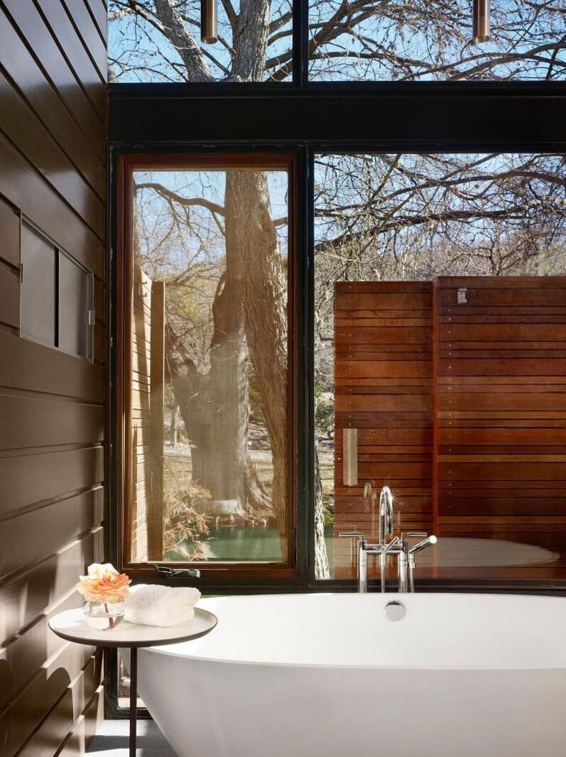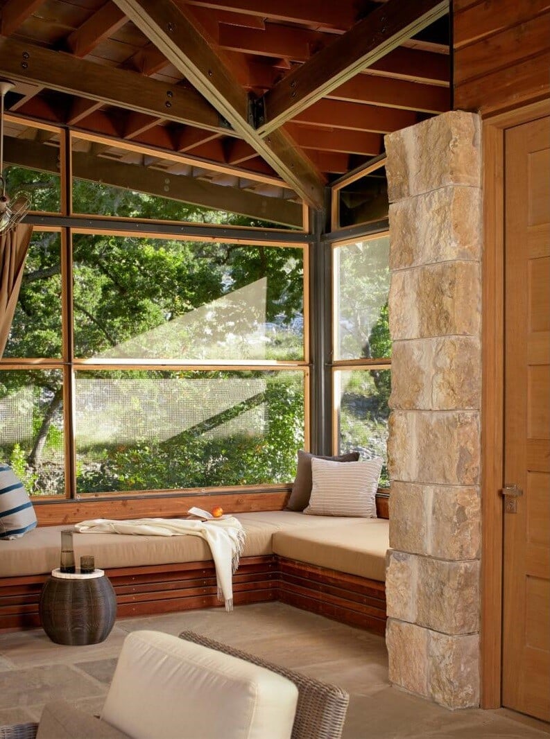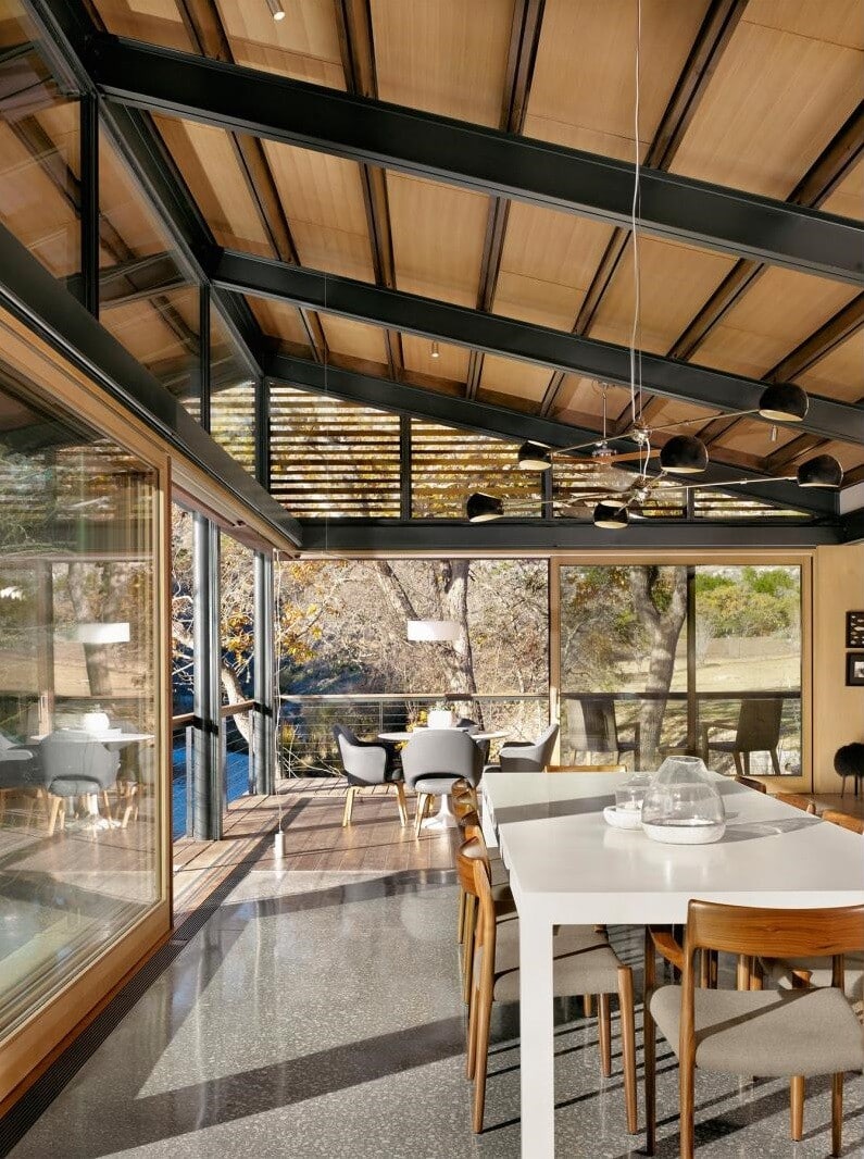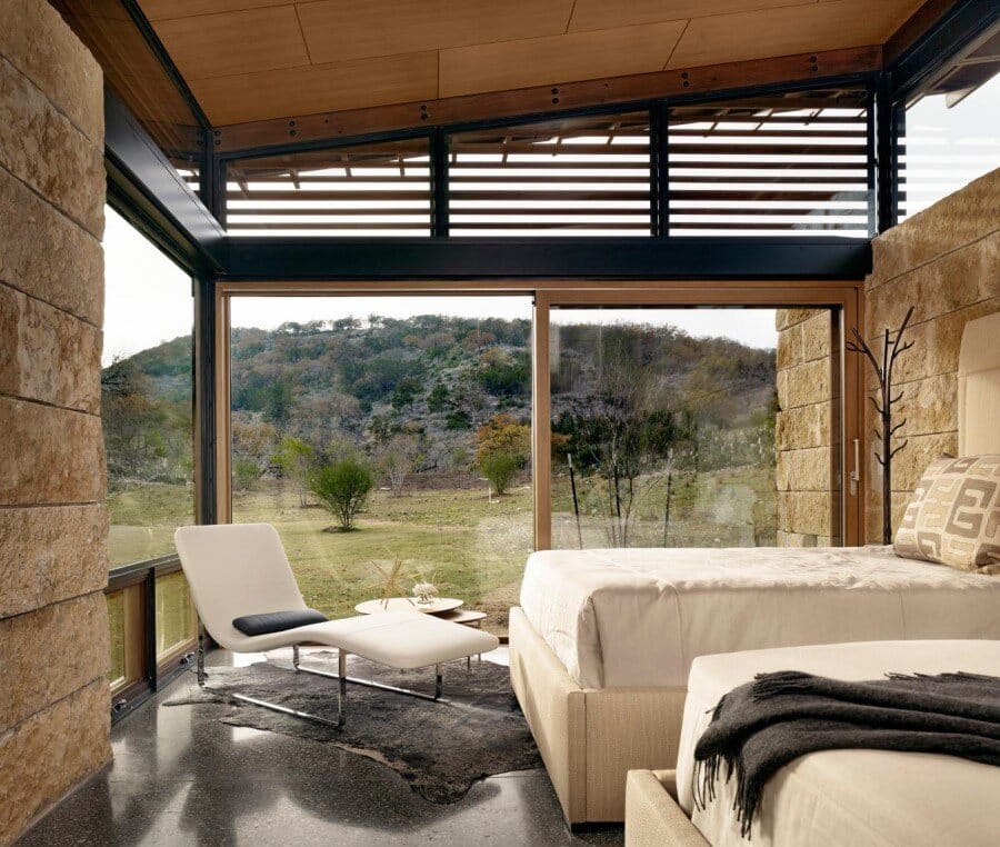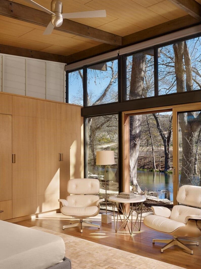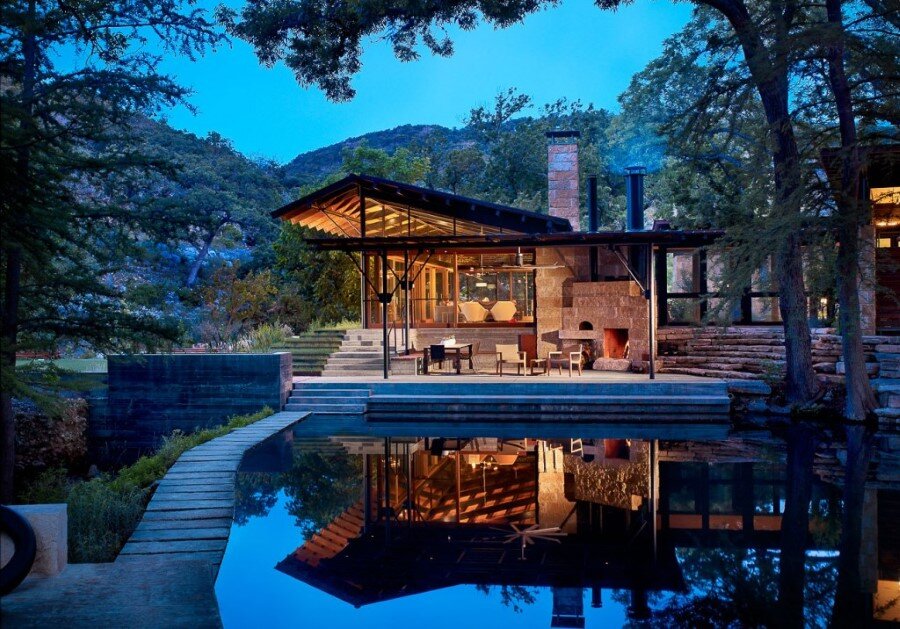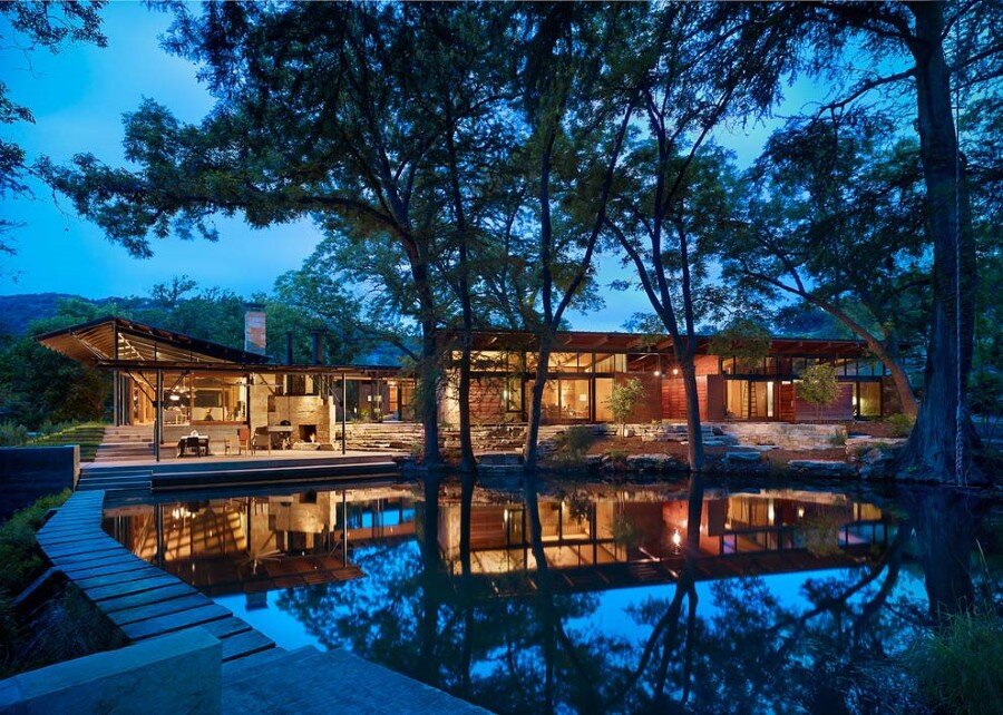 Mill Springs Ranch is a modern ranch house designed by Lake Flato Architects, located in Vanderpool, Texas. The interior design was conceived by Poët Interiors. Nestled at the confluence of two creeks on a Texas Hill Country Ranch, Mill Springs Homestead provides a water’s edge retreat.