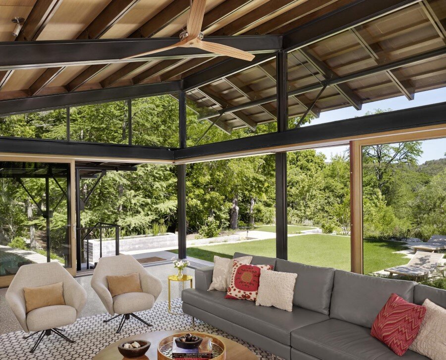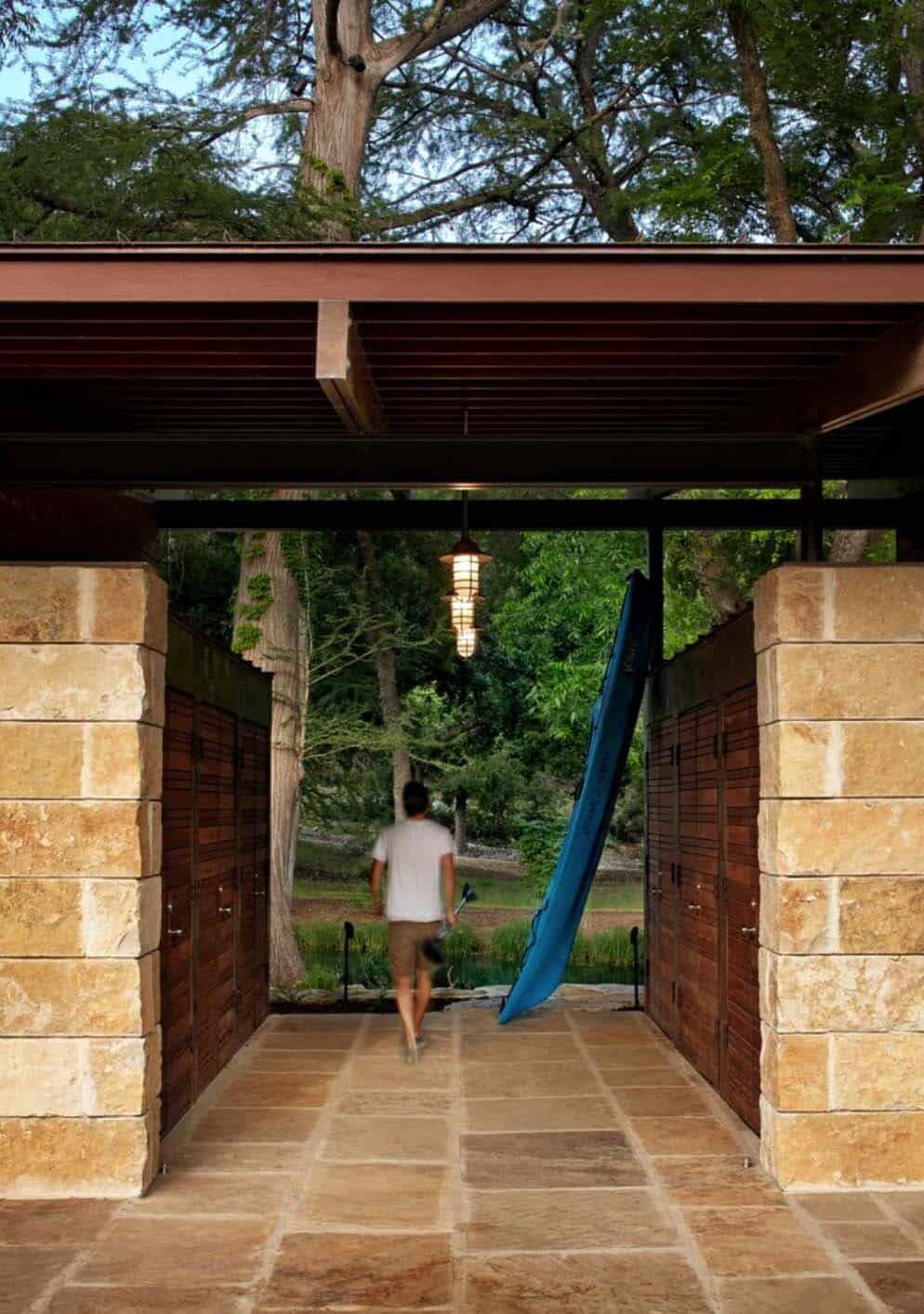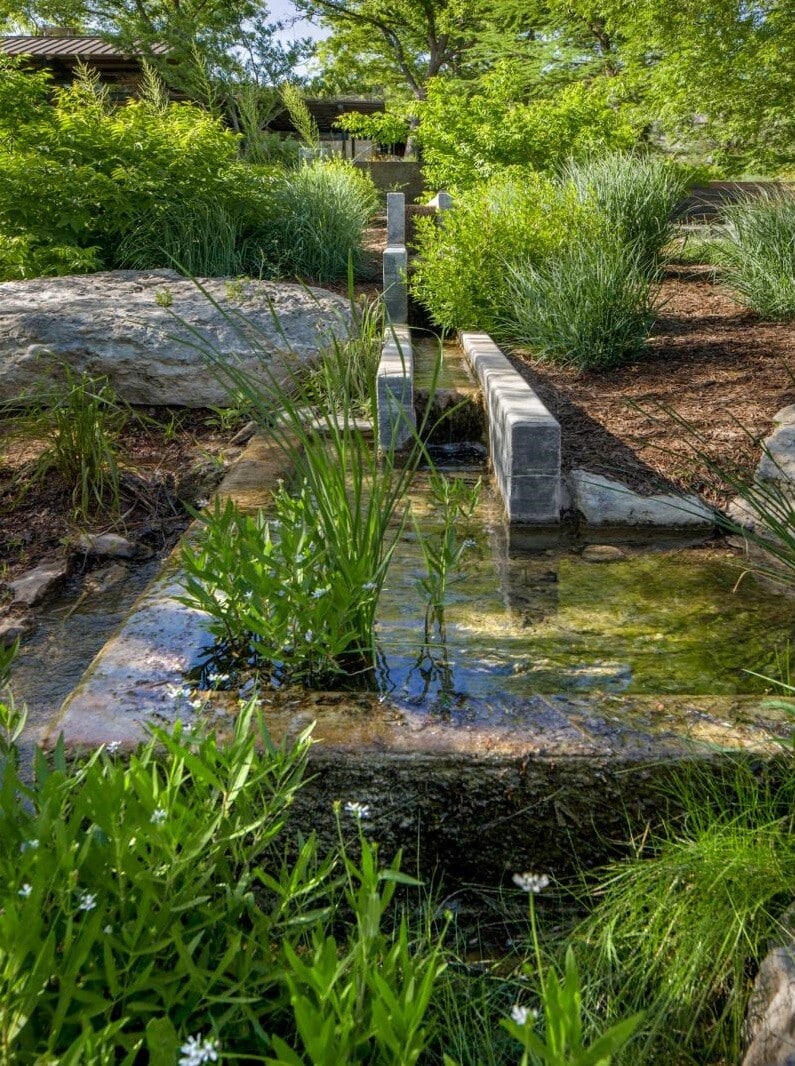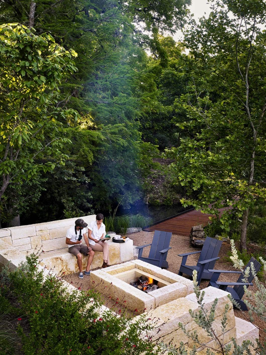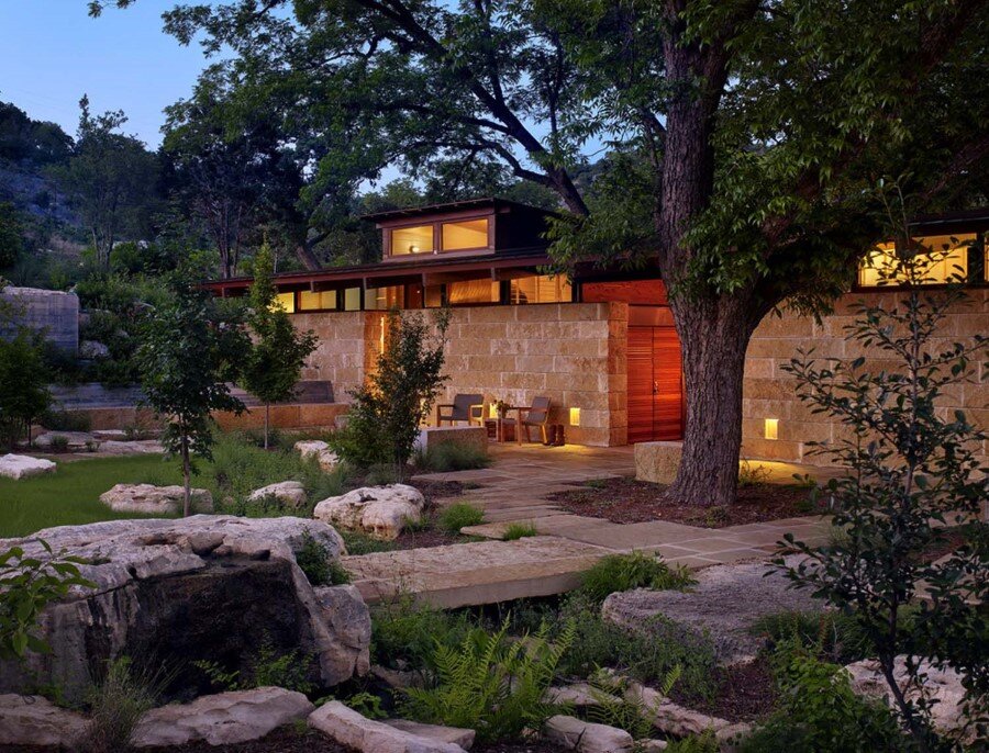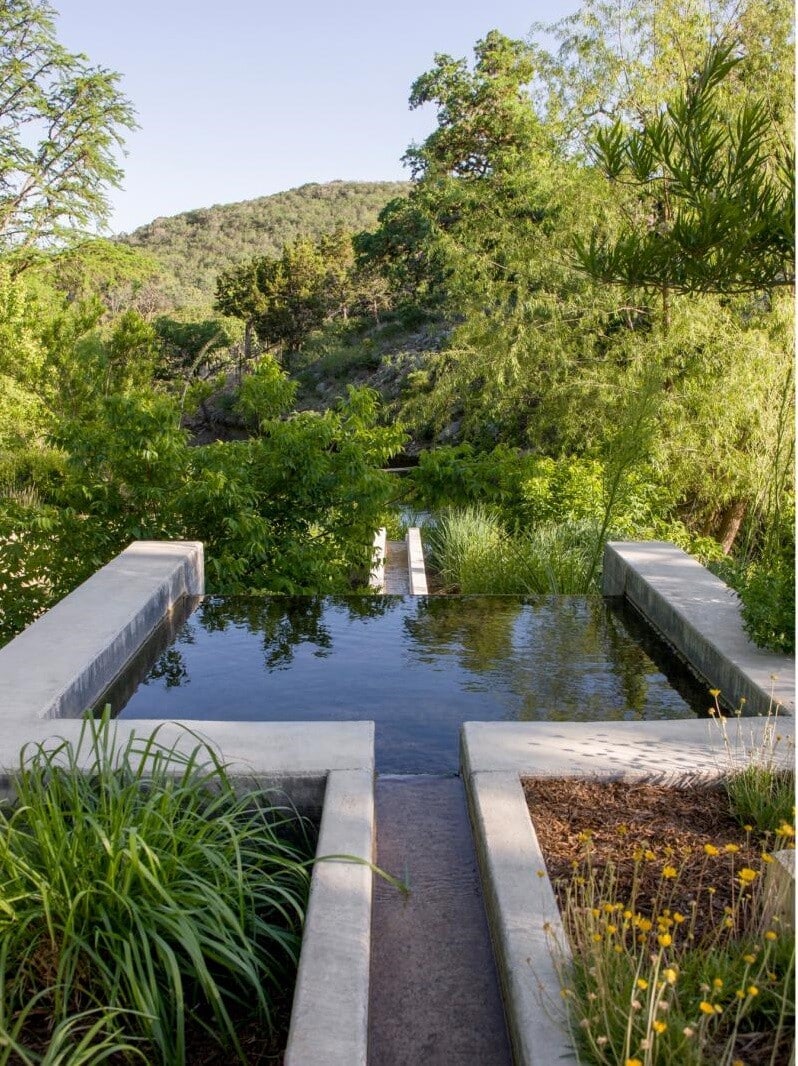 Focused on the main creek and pecan grove, bedrooms leverage two treasures in Texas climate: water and shade. A series of artifacts crafted of locally quarried limestone, steel and glass, Mill Springs reflects the spirit of the original dam.