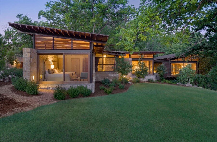 Four structures organize around the site of a 20th century dam, forming a courtyard shaded by mature pecan trees and an intimate connection to cool creeks.
