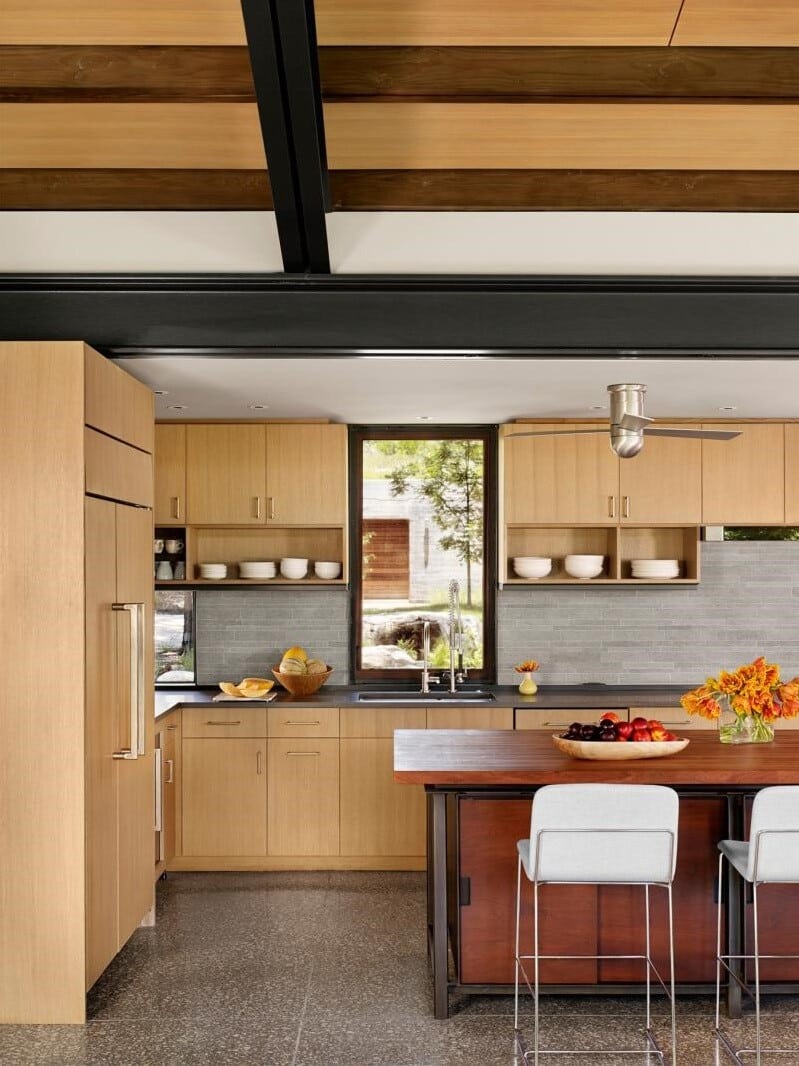 Anchored to the dam, the main living and gathering area provides dynamic views of the creeks and valley landforms shaped by time. Rooted in its place, interiors respond to the natural environment and merge with the landscape using a palette of regional materials that are tactile and modern.