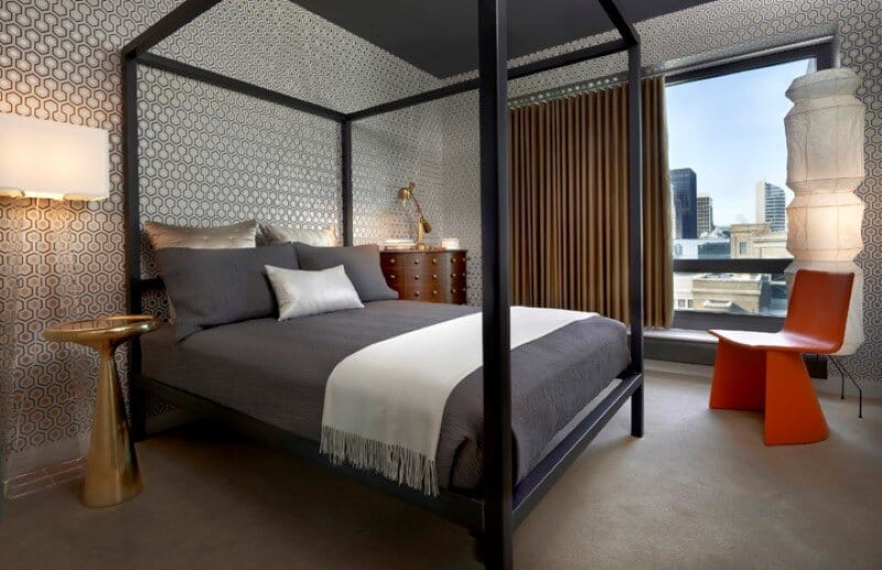 A geometric-patterned wall covering and contemporary furnishings deck out a guest room in style. The dark gray in the ceiling and bed covering grounds the room in a deep and restful calm.