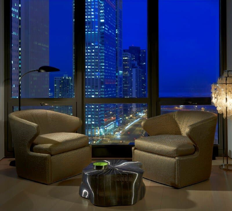 Description by Mitchell Channon Design: The owners chose this home because of its location adjacent to magnificent Millennium Park, overlooking such architectural gems as Frank Gehry’s Pritzker Pavilion with its ribbons of stainless steel, and Aqua, a hi-rise by Chicago architect Jeanne Gang. Their wonderful mix of lines and curves is now layered into this home’s architecture and furnishings. The result is a place of balance and beauty, in harmony with its surroundings.