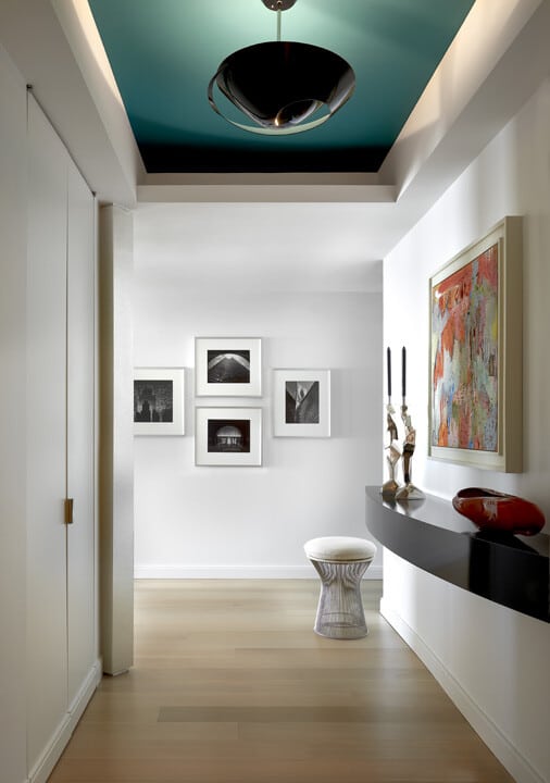 A curved black lacquered shelf in the foyer provides the perfect place for a pair of sculptural candlesticks. The swirling ceiling fixture above adds an organic element that prepares us for what is to come.