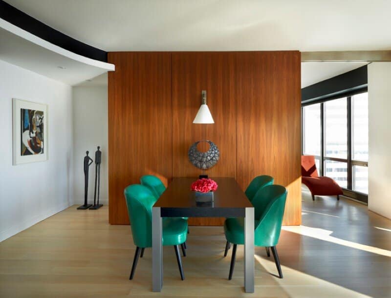 Urban sophistication and charm define the living room. The color scheme features jewel tones of aqua, emerald and teal set within a black and white architectural envelope. The teal sofa and emerald dining chairs are stunning against the walnut paneling. Inspired by the nearby Pritzker Pavillion, a curved wall in silver leaf expands the space. Warm walnut joins the living room with the kitchen. Inspired by the nearby Pritzker Pavillion, the metallic ribbons of a ceiling fixture spin light from above.