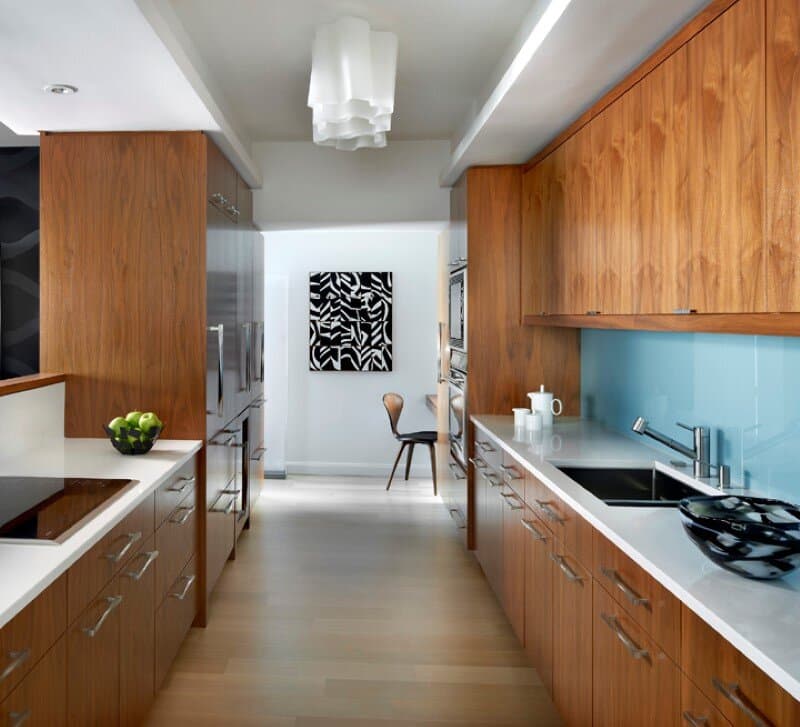 A Tiffany box blue glass backsplash in the kitchen reiterates a color found elsewhere in the home. The undulating Logico ceiling fixture adds a fun set of organic shapes. To create a fully integrated appearance, walnut is used on the cabinetry, the refrigerator and other appliances.