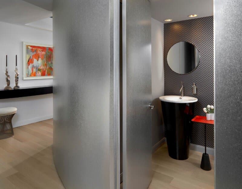 Behind the silver leaf wall, a powder room adds surprise and delight. The cone-shaped pedestal sink and table base sit perfectly against a geometric wall-covering.