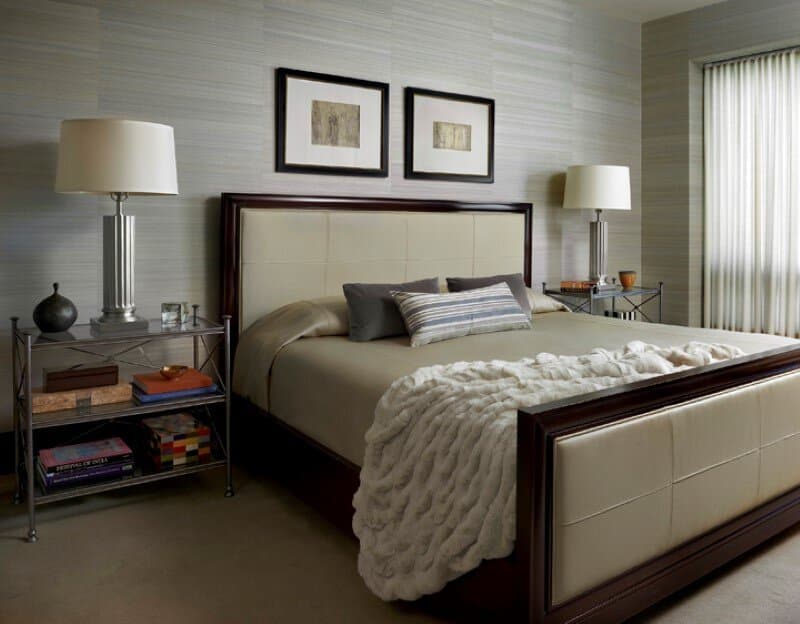 A sumptuous blue/gray silk wall-covering adds texture to the monochromatic color scheme and tailored furnishings of the master bedroom.