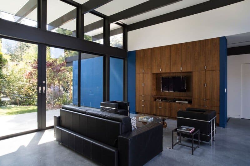 The changing moods of nature are reflected in the house due to the direct outdoor views at nearly every vantage point in the house. But with the house being on a large, wooded lot and down below the street, the owners are connected to nature all around but still afforded privacy from all sides. They are also protected from the elements: the super-insulated house with overhangs and heat-mirror glass requires no air-conditioning and exceeded California’s strict energy codes by almost 40%.
