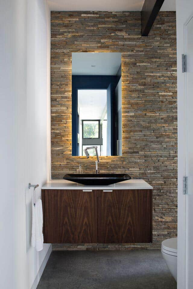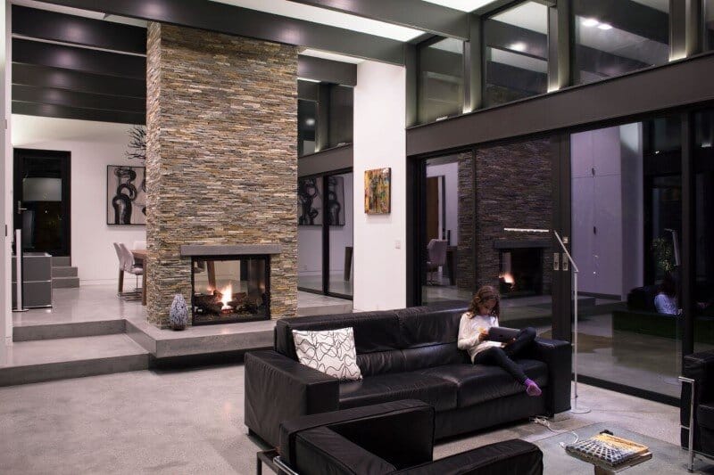 Enter through simple planes of stacked stone and white stucco below street level to reveal the roomy, open spaces that are progressively revealed as one flows through the Modern Atrium House. Progress through the spaces, stepping down with the sloping hillside until you arrive in the indoor/outdoor living room. The large, green, landscaped yard and Japanese garden-inspired atrium are visible through two large walls of glass.