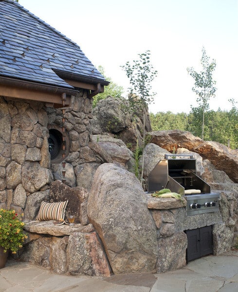 So let’s follow the alley to this beautiful cottage! The curbed lines, mixed with clear ones, give an impression of stability, but in the same time of warmth. The backyard with chaise longues and grill inspire relaxation, comfort and invites you to try the pleasure of preparing your own meals, directly on the fire, in the middle of the nature, just like our ancestors used to. The color of the sashes, of the roof and the doors harmonize with the color of the stone. The sliding backside doors are made of glass and allow lots of natural light and invite to the contemplation of the forest around the house. As a touch of style, I liked the round windows that give a distinguished impression.