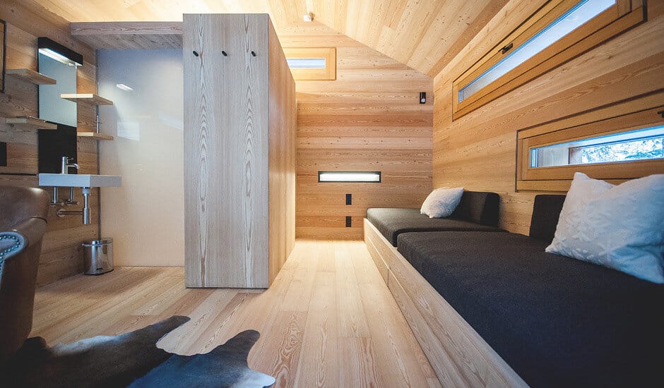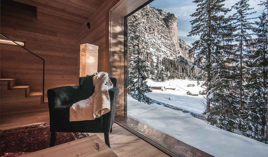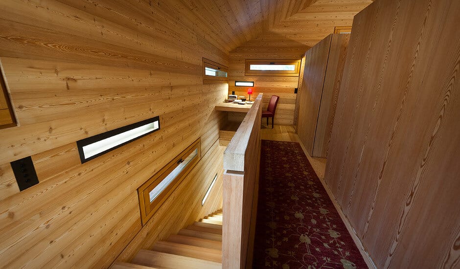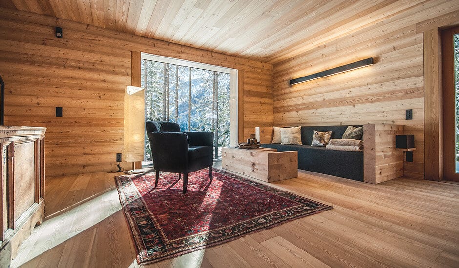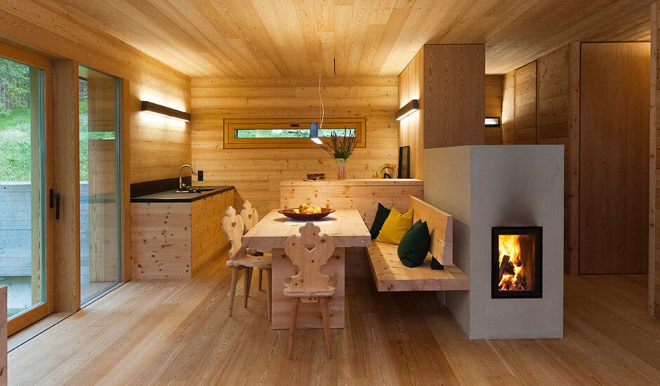The interior design is inspired by alpine traditions, but with a modern interpretation: the all-wooden rooms are dominated by clean lines and minimalist design. The only frills are the chairs wich are modelled after typical Tyrolean chairs.