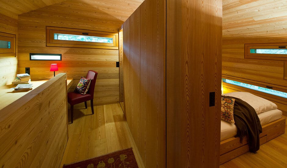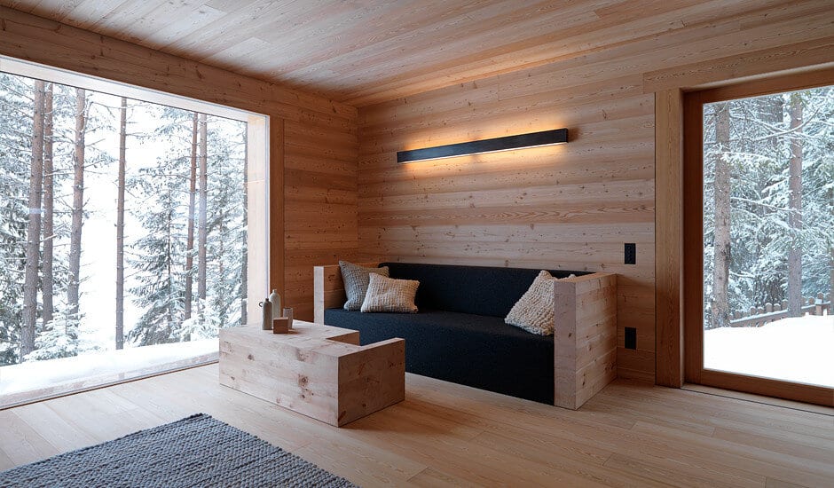 The lodge consists of two structures, the two-storey main building and a small guest house. Striking style feature are the windows: upstairs the elongated asymmetrically arranged viewing slots structure the facade and provide the bedrooms with a meditative atmosphere. On the ground floor, however, panoramic windows overlooking the forest, meadows and mountains flood the rooms with light. If necessary, the window can be closed with large wooden sliding shutters.