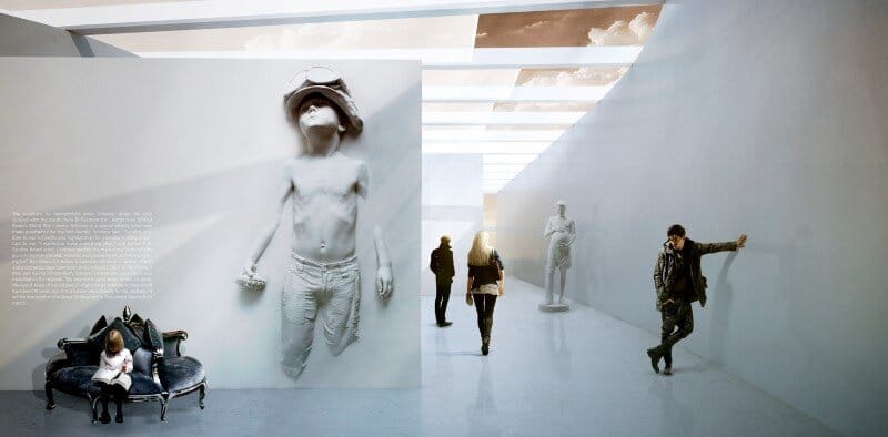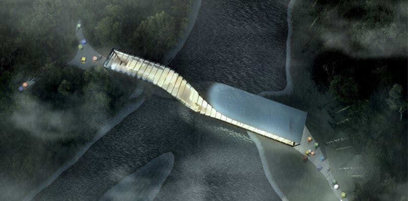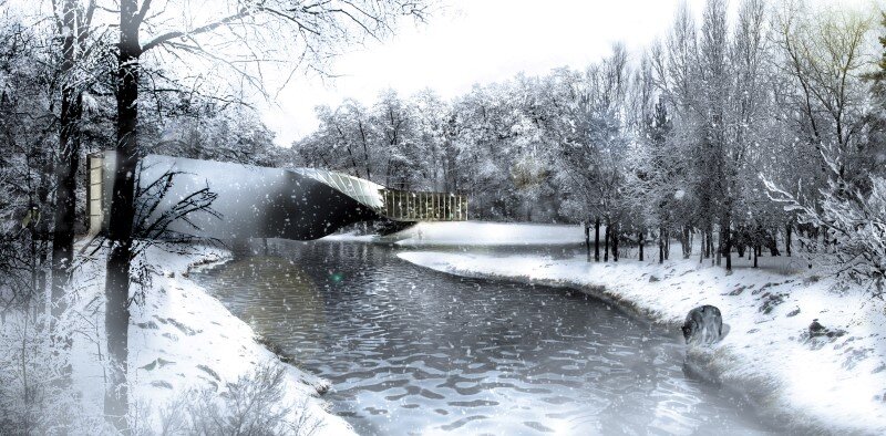 On this site we proposed a raw and simple form that would respond to the challenges of the landscape: a building, sculpture, and bridge – all in one. The bridge connects the property to create a series of landscape galleries. The continuous path that is formed will enable access to each of the different outdoor galleries and provide new and otherwise unattainable vistas of the riverbank and the historic mill.
