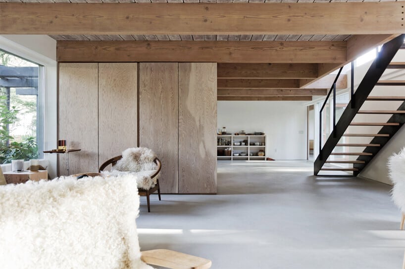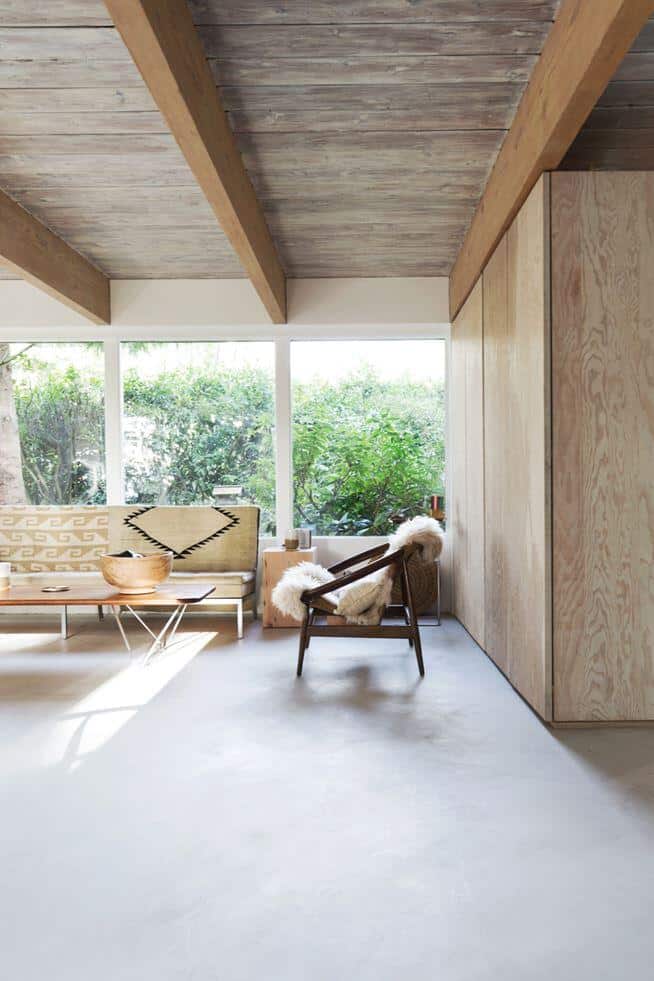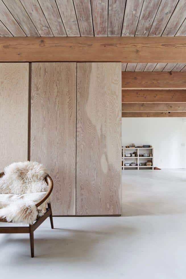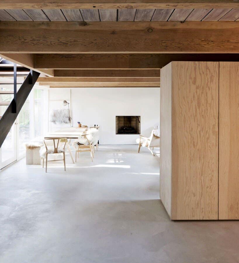 To brighten the spaces the douglas fir beams were lye washed and the structural decking was finished with a cloth applied pigmented oil. The living spaces were reduced to the structural shell, the walls were repaired and finished in a natural lime based whitewash and the floors ground and troweled.