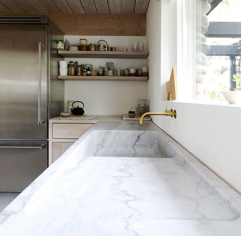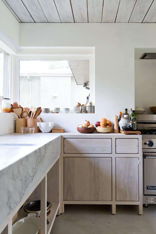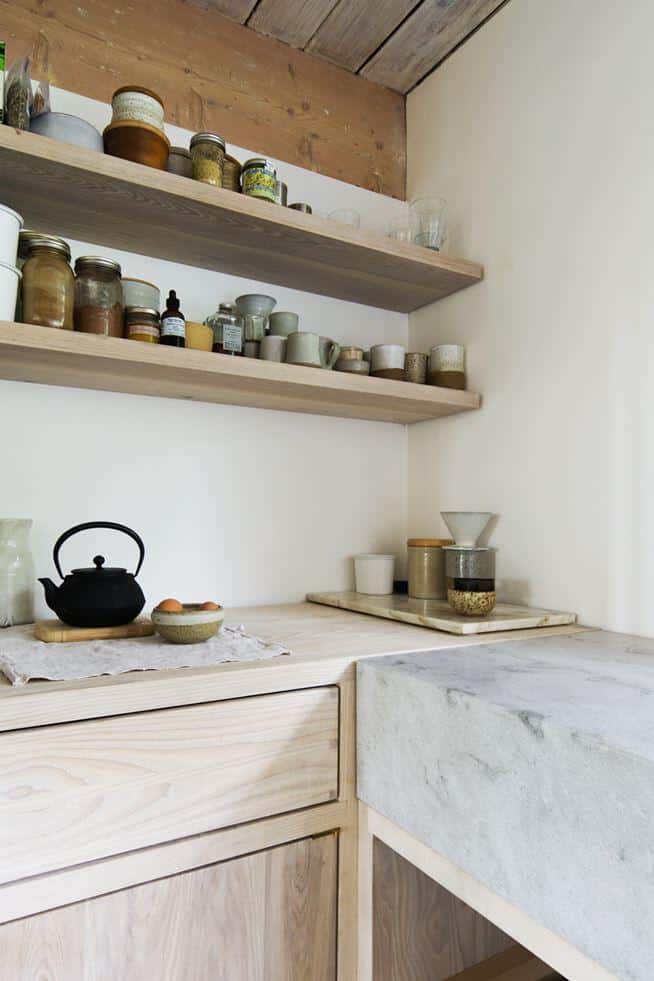 The kitchen was crafted of solid ash and designed for the open storage of the owners collection of studio pottery. While open and light in section, the joinery was detailed to structurally bear the weight of the 800kg marble counter monolith which was milled from a block the architects selected from the Hisnet Inlet quarry located on Vancouver Island near their own alpine cabin.