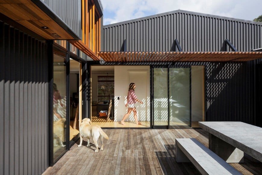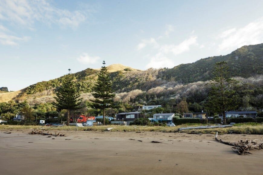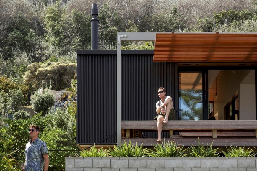 The architect’s description: From a context of accrued bach-esk dwellings in a south facing coastal surf community, a strategy of sequencing building sets (aka surf) was generated to scale new form to its surrounds. Building sets are then offset to allow seasonal living and circulation options for variations in wind and sun exposure.
