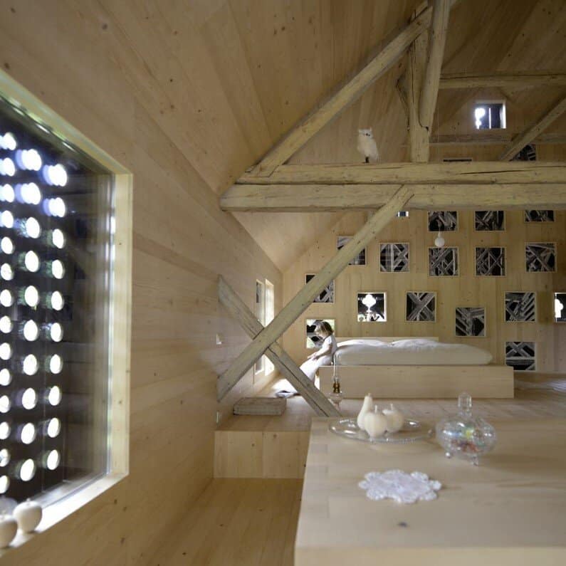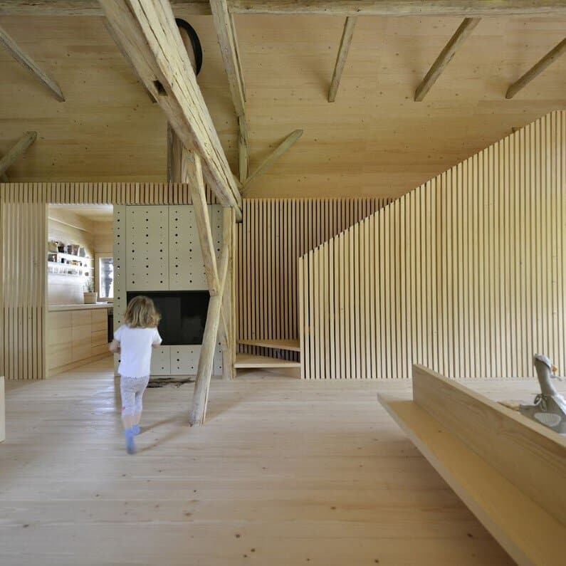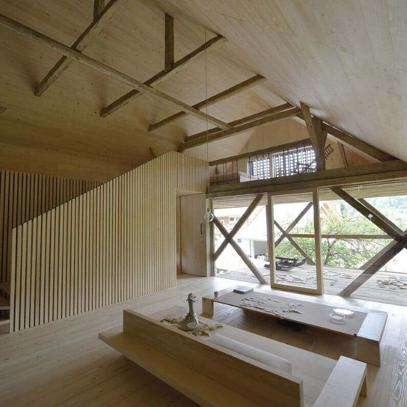 The concept converts old barn into a loft apartment by leaving the original exterior appearance intact in contrast with creating a new internal wooden shell. Originally, ground floor served as stable for stock and upper level for drying and storing hay and farm equipment. The existing ramp, which leads to the wooden deck above cattle area – is kept and serves as the main entrance to the new gallery apartment. The former external storage area next to the entrance is converted into the porch overlooking the Alps. All external wooden cladding and concrete roof slates are maintained, the only intervention are perforations into wooden parts behind internal windows and opening of the front porch.