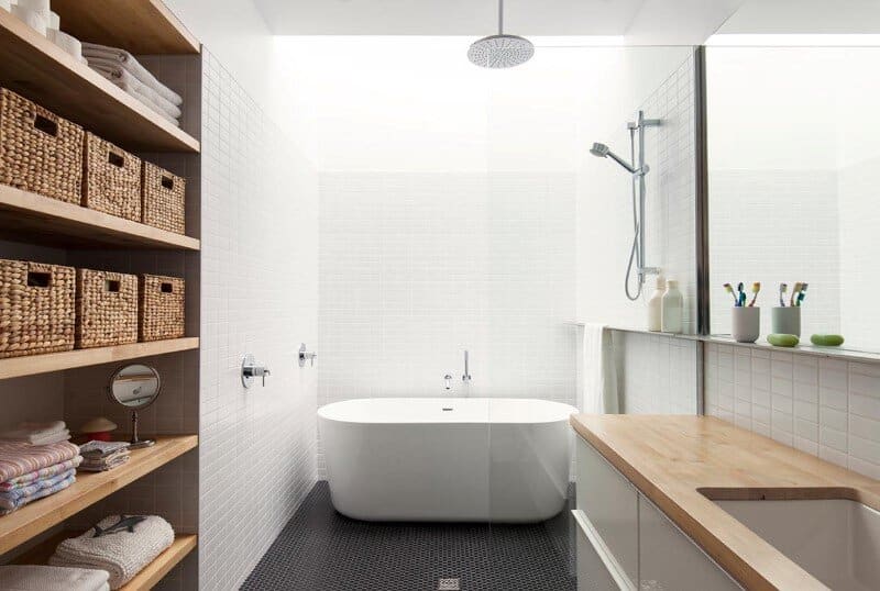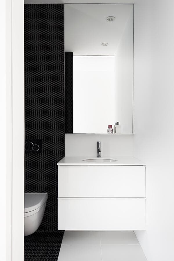 At the top of the stairs a large hallway that opens on the living room’s double height space regulates access to bedrooms and the bathroom. This circulation, controlled by a multitude of sliding doors, creates a space in constant evolution throughout the day. The master bathroom contains a skylight the same width as the room itself and is thus flooded with natural light that is reflected by white ceramic walls, a freestanding bathtub and the large mirror above the vanity. The black hexagonal mosaic floor as well as solid wood horizontal surfaces act as contrasting elements in relation to the omnipresent whiteness of the bathroom.