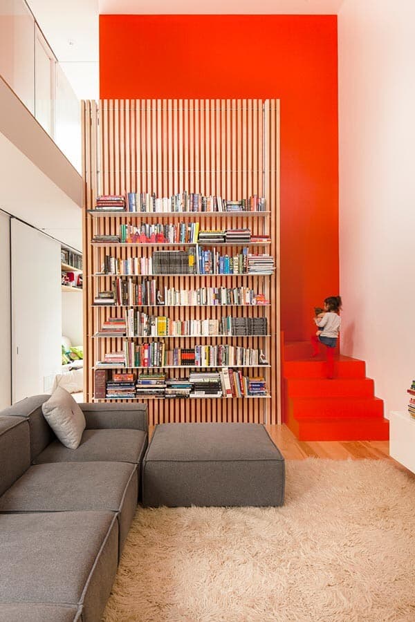 The living room, aligned with the kitchen, benefits from having twice the ceiling height which brings light from the first floor down to the ground floor. This space is framed between two pieces of woodwork wooden slats that filter and play with the occupant’s perception of the living room’s spatial limits. On one side, an elegant bookshelf extends to the double height space and acts as a screen that hides the stairs. Thin white steel tablets are integrated in the wood lattices and create a contrast with the orange background provided by the stairs. On the other side of the living room are a bridge and railing that are made of materials matching those used in the bookshelf; this bridge lets the occupant have a sneak peek at the office above.