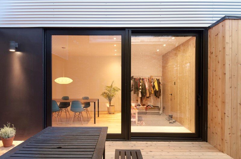 At the rear, the house’s original volume was preserved while removing a portion of the first floor in order to create a patio. This removal allowed for an alleviation of the building’s density in relation to the backyard, while providing the garden with further natural light and a more open line of sight. A galvanized corrugated steel coating was applied to the first floor in order to lighten the enclosed exterior area while offering a sustained contrast between various black elements of the façade and fence separating the yard from the alleyway. As for the garage, it was located in a light wood block that extended from the inside of the house, thus amplifying the continuity between indoors and outdoors already highlighted by the extension of the wooden floor between the kitchen and outdoor patio. For more information visit la SHED architecture. Photos Maxime Brouillet