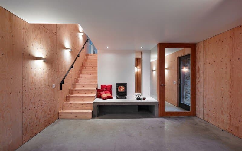 The original walls were consolidated and repaired using stone from the site, and re-pointed with lime mortar. Any new openings in the stonework were edged in galvanised steel and the new timber structure clad in black stained timber as subservient to the original walls. Internally the walls are clad in construction grade spruce plywood, with a more pristine plastered core. Floors are pine boards and polished concrete. Photographs: Andrew Lee